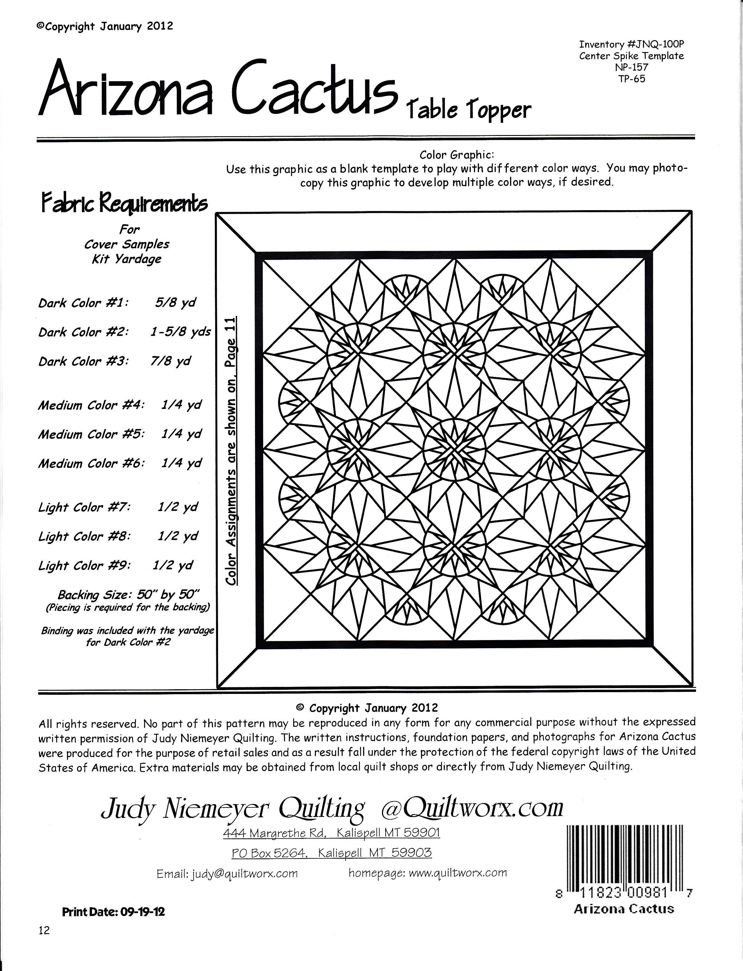 Arizona Cactus Table Topper is a foundation paper pieced pattern. Pattern Includes: Instructions, Cover Sheet, Yardage Information, Foundation Papers. Finished Size: 42 inches x 42 inches. Fabric not included.