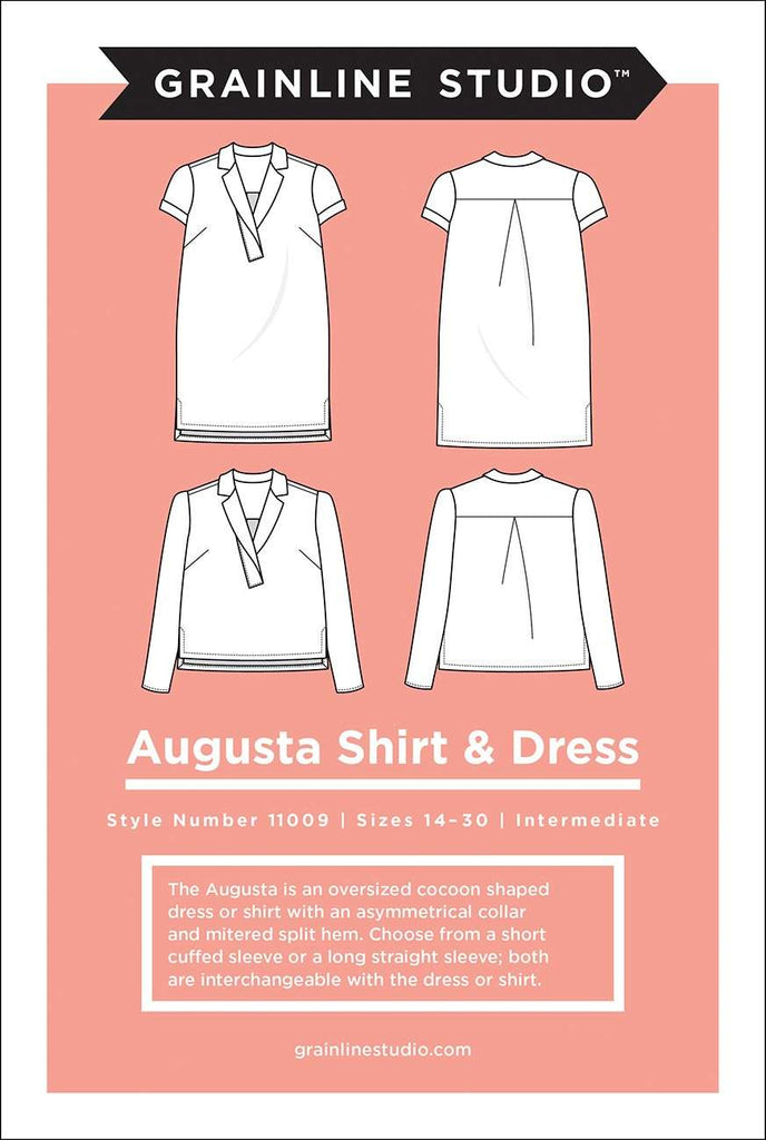 The Augusta is a cocoon shaped dress or shirt with an asymmetrical collar and mitered split hem. Choose from a short cuffed sleeve or a long straight sleeve; both are interchangeable with the dress or shirt.