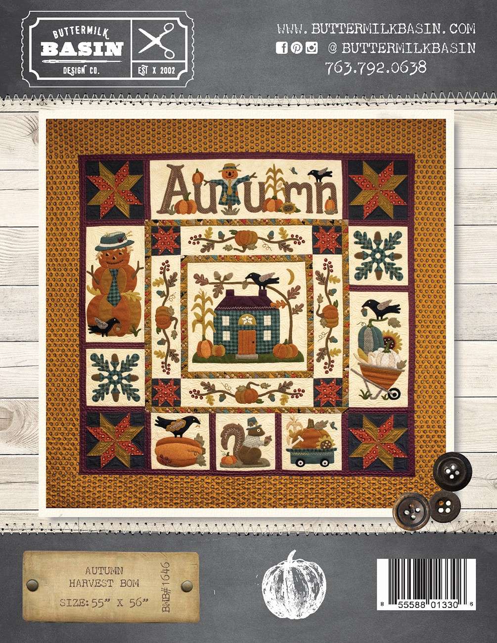 Autumn Harvest is a stunning quilt that features wool and cottons from. The tones are warm, the designs are filled with the bounties of fall & each block could also stand alone! Finished Size: 55 inches x 56 inches. Fabric not included.