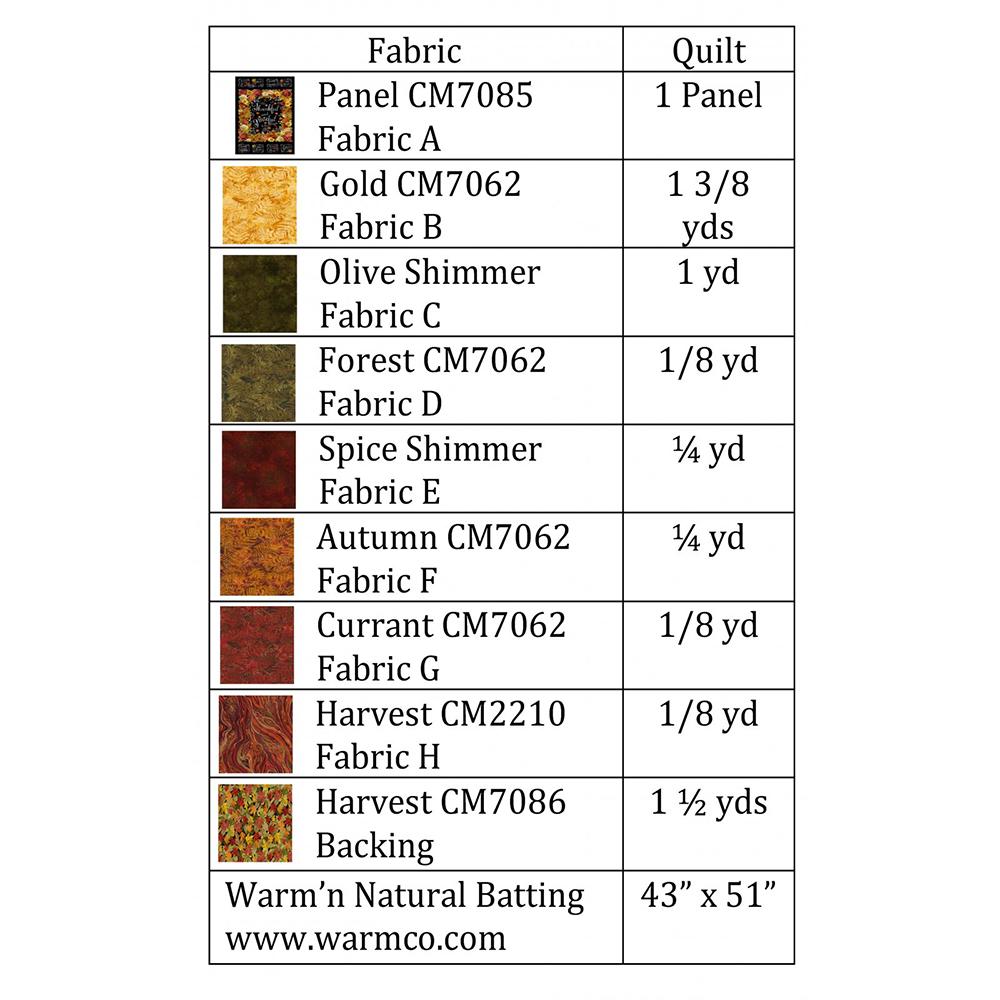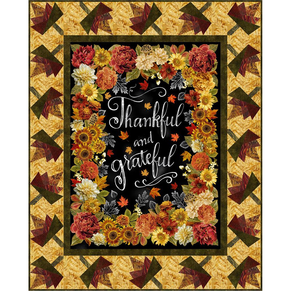 Welcome the fall season and gather with family and friends...sew much to be grateful for. Paper pieced patchwork leaves fill the border surrounding the festive center panel. Paper piece these easy leaves to show your appreciation of fall’s splendor. Designed by Tamarinis. Pattern only.