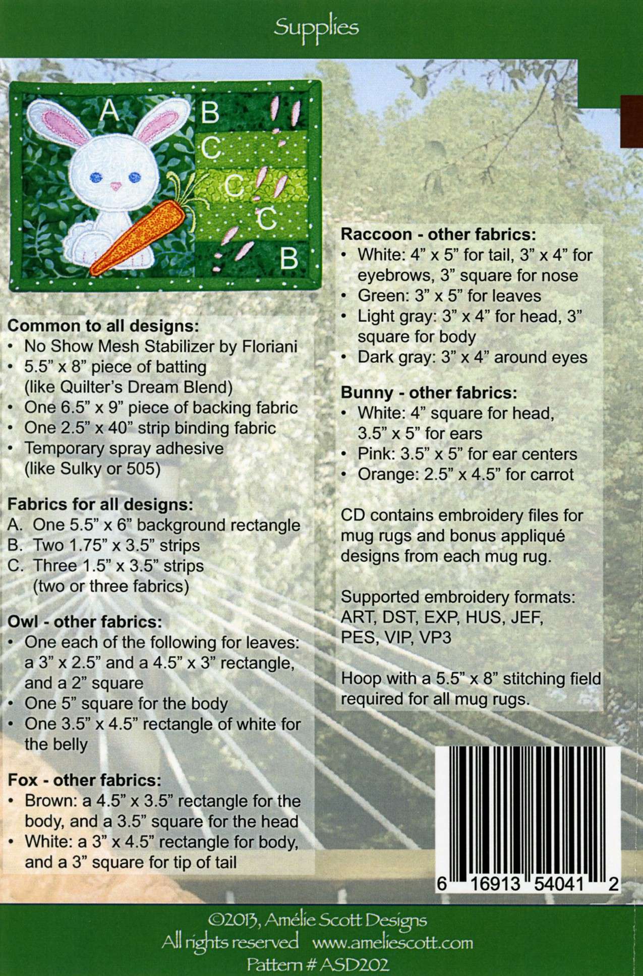 Backyard Buddies Mug Rugs pattern includes four Critter-inspired designs: a bunny, a fox, an owl, and a raccoon. The pattern includes digital embroidery files for all major machines, step-by-step instructions with photographs, and bonus appliqué designs that you can use on other projects. Hoop with a 5-1/2 inch x 8 inch stitching field required for all mug rugs. Supported Embroidery Formats: ART, DST, EXP, HUS, JEF, PEC, PES, VIP, VP3. Fabric not included.