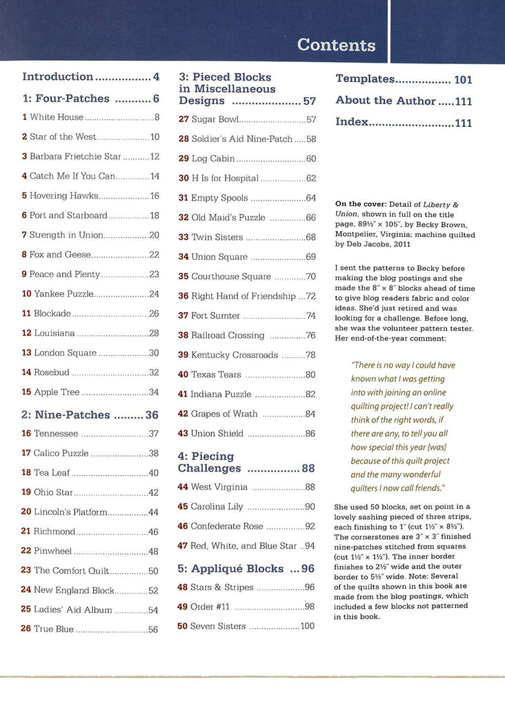 Journey through a historic time in American history with Barbara Brackman, bestselling author and quilt historian. Barbara’s book features fifty quilt blocks that commemorate the 150th anniversary of the Civil War. Each block (most were first published in the 1930s) was selected for the symbolism its name lends to recounting stories from the era’s women. This compilation of quilt block patterns includes period photos and first-person accounts. Choose from pieced or appliquéd blocks, each in two colorways with instructions for 8” and 12” sizes. Dig into your reproduction fabrics and enjoy combining blocks to make your own tribute quilt.