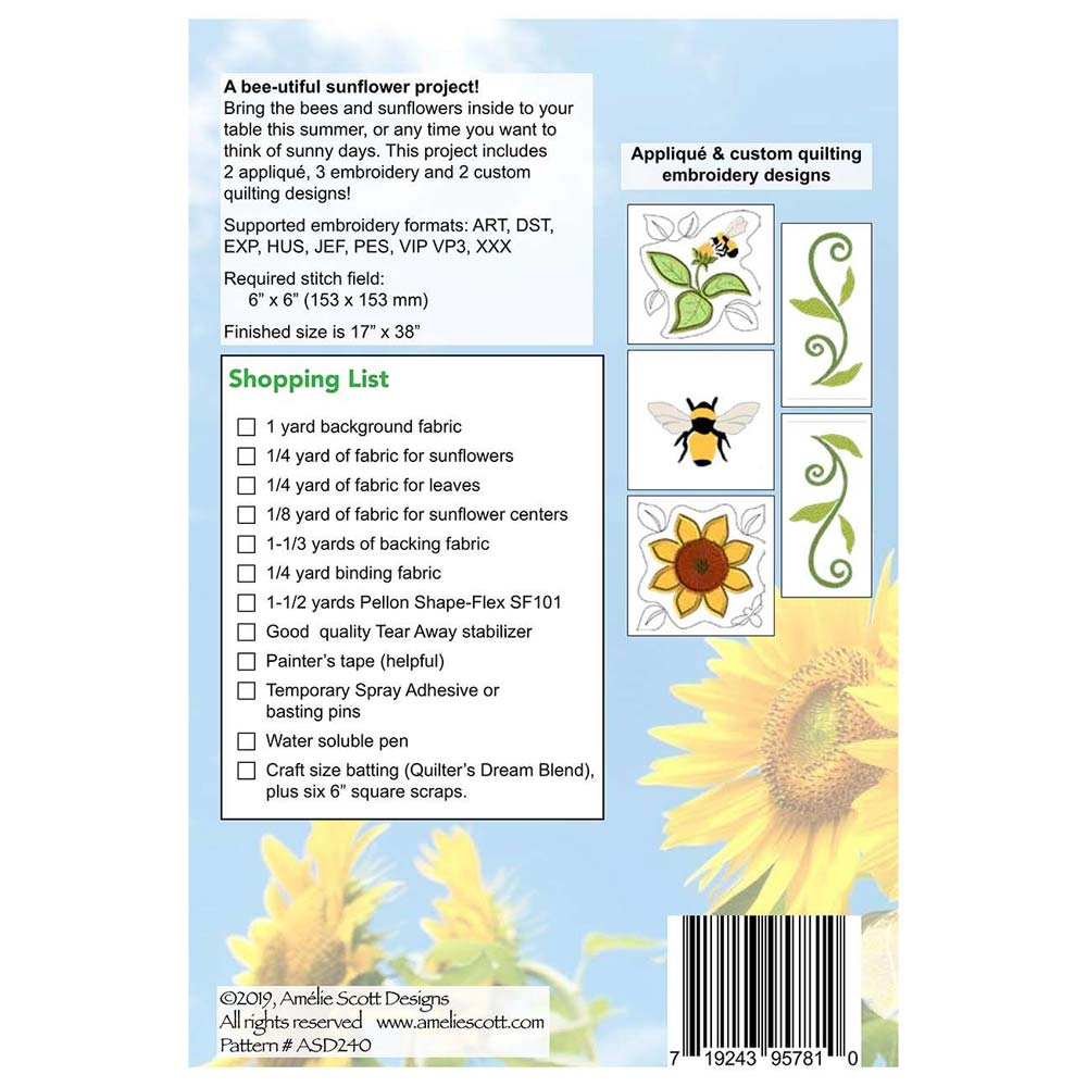 Bring sunflowers inside to your table this summer, or any time you want to think of sunny days. This project includes 2 appliqué, 3 embroidery and 2 custom quilting designs! Supported embroidery formats: ART, DST, EXP, HUS, JEF, PES, VIP VP3, XXX. ¿Required stitch field: 6” x 6” (153 x 153 mm). ¿Finished size is 17” x 38”