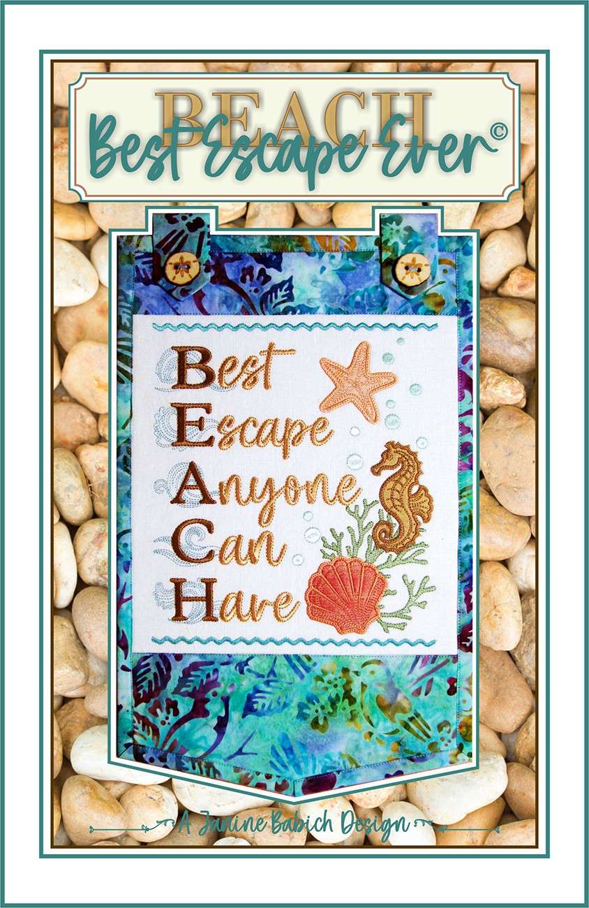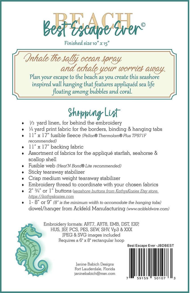 Inhale the salty ocean spray and exhale your worries away. Plan your escape to the beach as you create this seashore inspired wall hanging that features appliqued sea life floating above a coral fan and bold, satin stitch lettering. Hanging tabs adorned with cute buttons finish this project. Finished size when displayed: 11" x 17". Includes embroidery formats: ART7, ART8, DST, EMB, EXP, HUS, JEF, PCS, PES, SEW, VP3 & XXX. SVG & JPEG images included. Requires a 6" x 8" hoop.