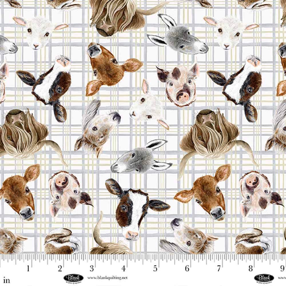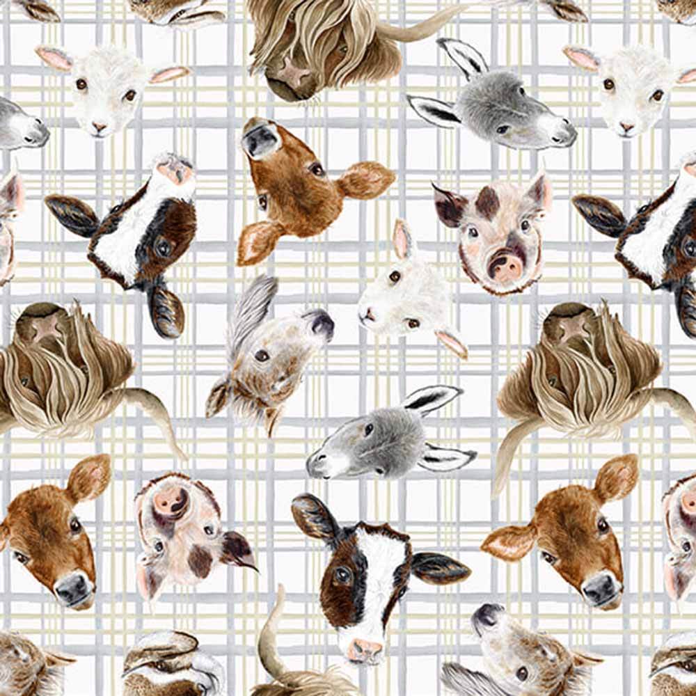 Sweet farm animal faces on a background of plaid are featured in this print by Moque Lee Studio for Blank Quilting. Design is from her Little Seedlings Farm collection.