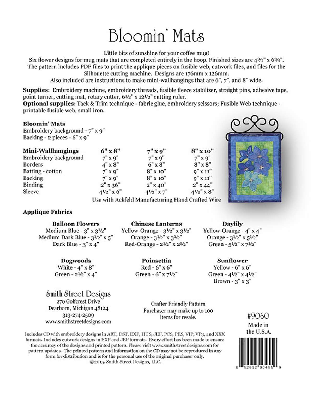 Little bits of sunshine for your coffee mug! Six flower designs for mug mats that are completed entirely in the hoop (sizes 4 3/4 inches x 6 3/4 inches). The pattern includes PDF files to print the applique pieces on fusible web, cutwork files, and files for the Silhouette cutting machine (designs are 176mm x 126mm). Also included are instructions to make mini-wallhangings that are 6 inches, 7 inches, and 8 inches wide. Formats: ART, DST, EXP, HUS, JEF, PCS, PES, VIP, VP3, and XXX. Fabric not included.