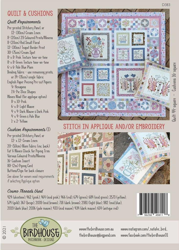 The theme is floral garden. The quilt features two large applique/embroidery blocks and eight small embroidery blocks. Instructions for both the quilt and cushion projects are included in this pattern, and instructions for both applique and embroidery options. In my quilt, the two large blocks are stitched in applique, and I have also used a little applique in a couple of the smaller blocks too. However, you can choose to stitch the larger designs in embroidery if you wish. I love to mix these techniques. I have presented the large blocks as embroidery in the cushions, which are also included. The pattern is presented in larger size format, with full size line artwork of the stitchery/embroidery designs. The finished size of the quilt is 44in square, and the cushions are 16in square.