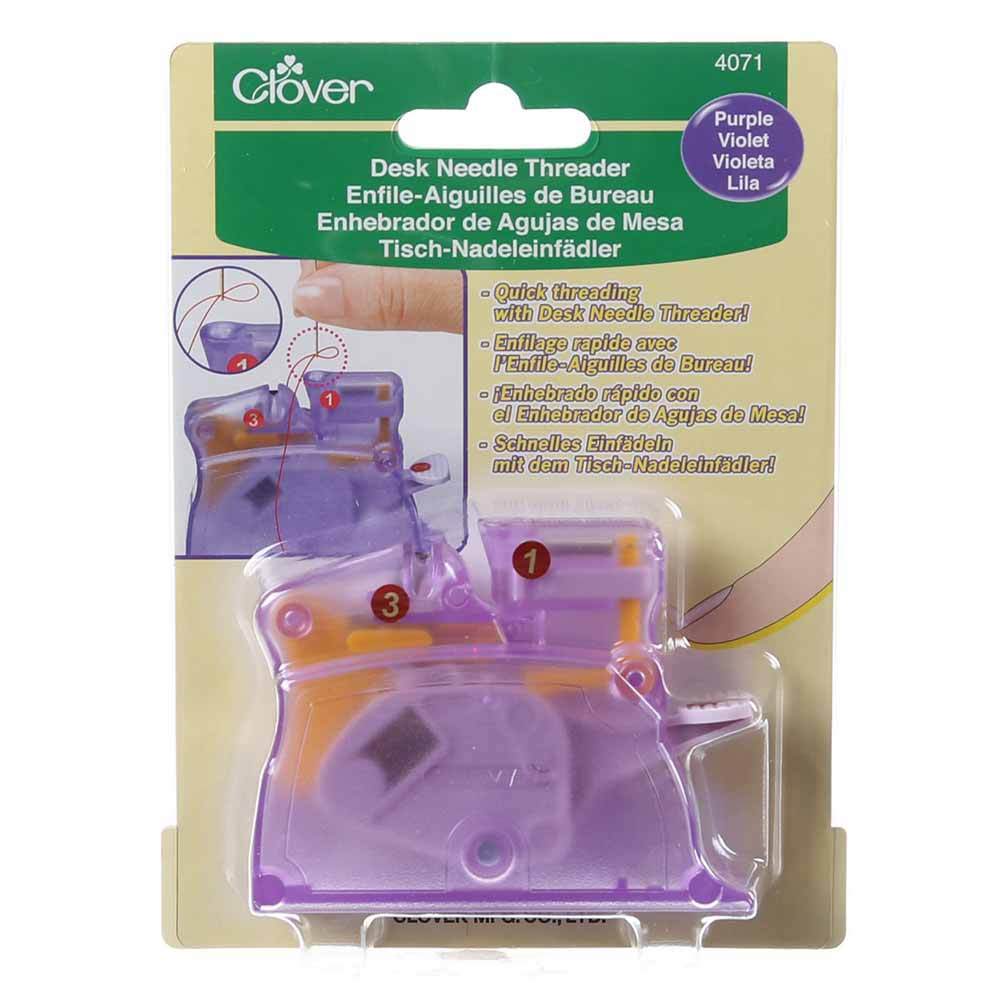 Clover Desk Needle Threader can be used to thread thick and fine needles. Insert the thread in the groove, set in the needle, eye part down and press the lever. Pull out the threaded needle and cut the thread. What could be easier?