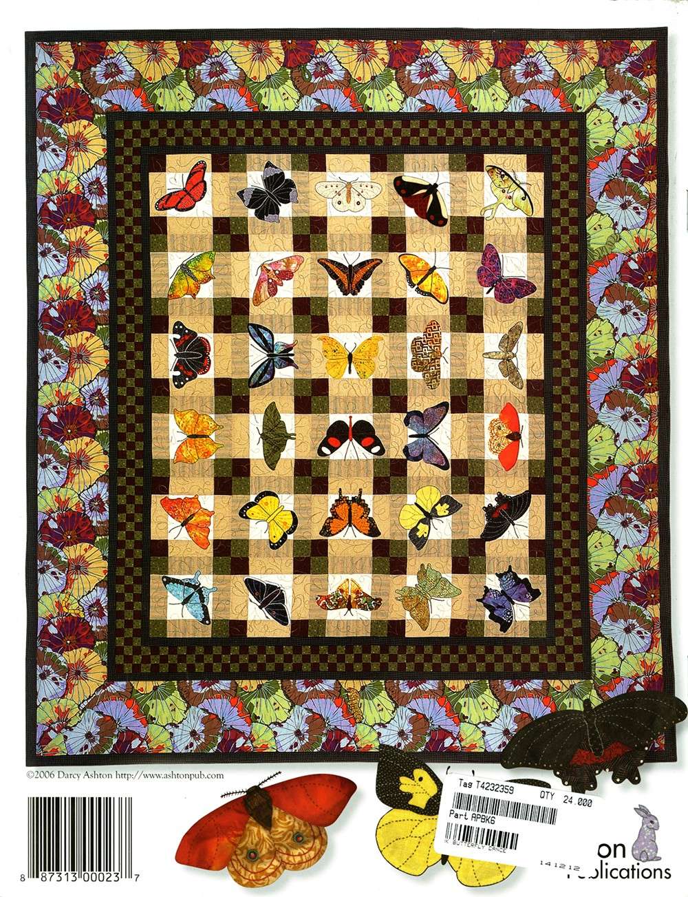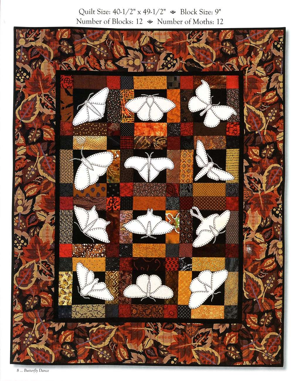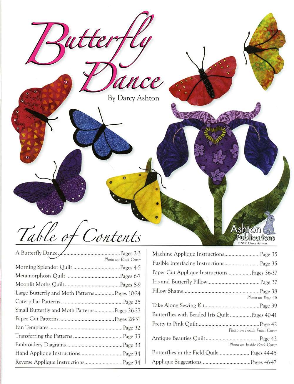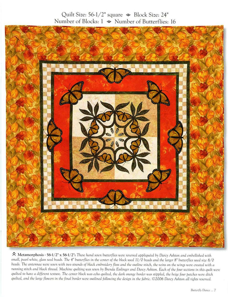 Butterfly Dance is a beautiful book which contains more than 40 different butterfly and moth patterns, two paper cut patterns, and a page of caterpillars. These patterns are large and easy to sew from just one big piece of fabric, or make them from several different fabrics. The choice is yours to make them as easy or as hard as you wish. Five different appliqué techniques are described in the book as well as 11 different quilts and projects including "Butterfly Dance", "Moonlit Moths", "Pretty in Pink", "Antique Beauties", and "Metamorphosis".