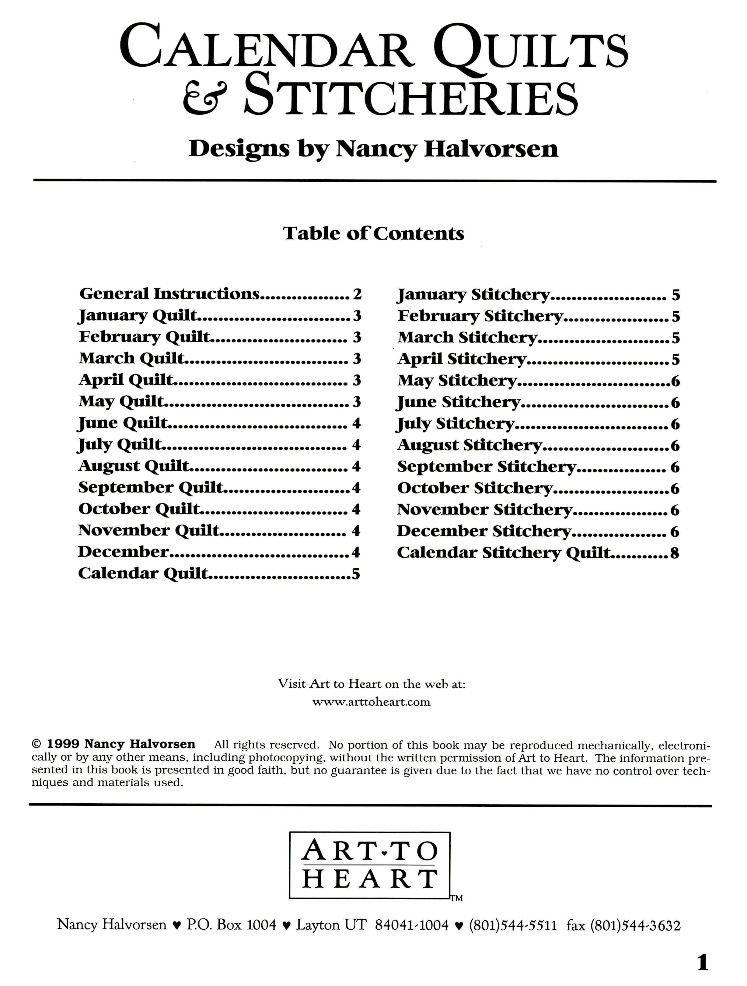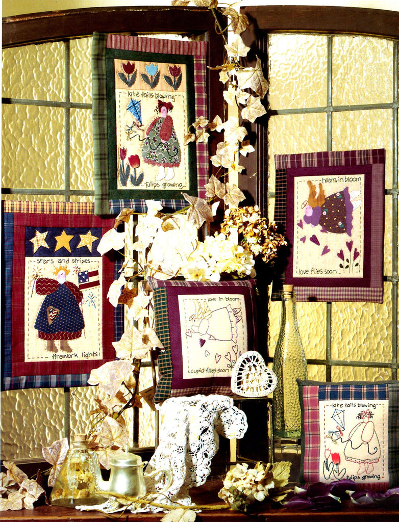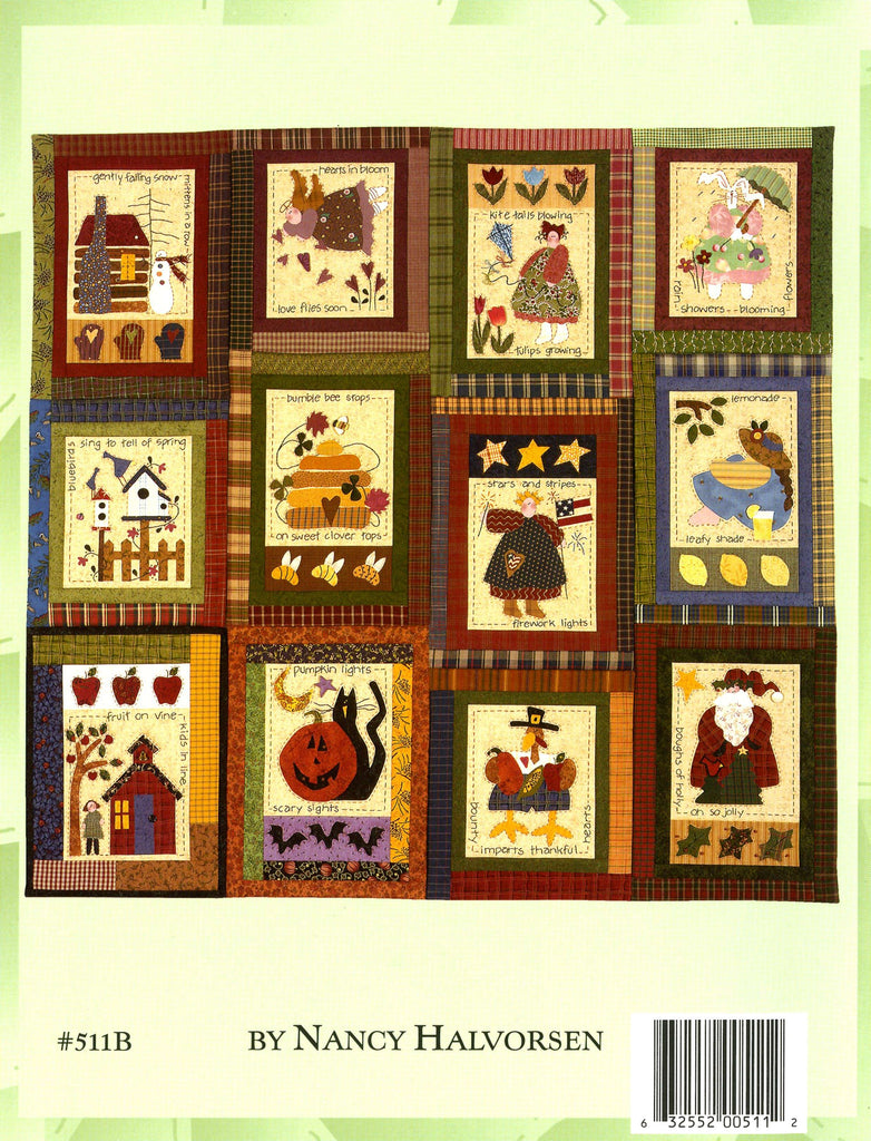 This 28-page book includes an applique quilt for each month and a stitchery pillow for each month. Instructions are also included to sew the twelve applique blocks or stitchery blocks into a large quilt.