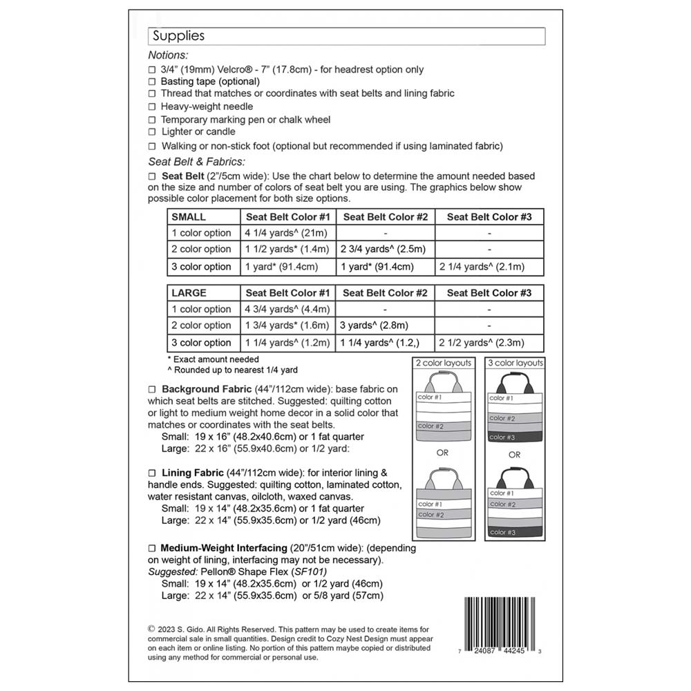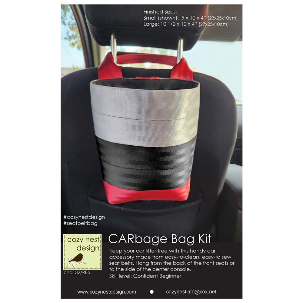 Stitch up a seat belt CARbage Bag! This handy vehicle accessory keeps your vehicle free of wrappers, cups and debris. This kit contains pattern and seat belt - just add fabric, interfacing and hook and loop tape. Seat belt webbing is extremely durable, easy to clean, and easy to sew on a home machine. Kit is for the small size bag.