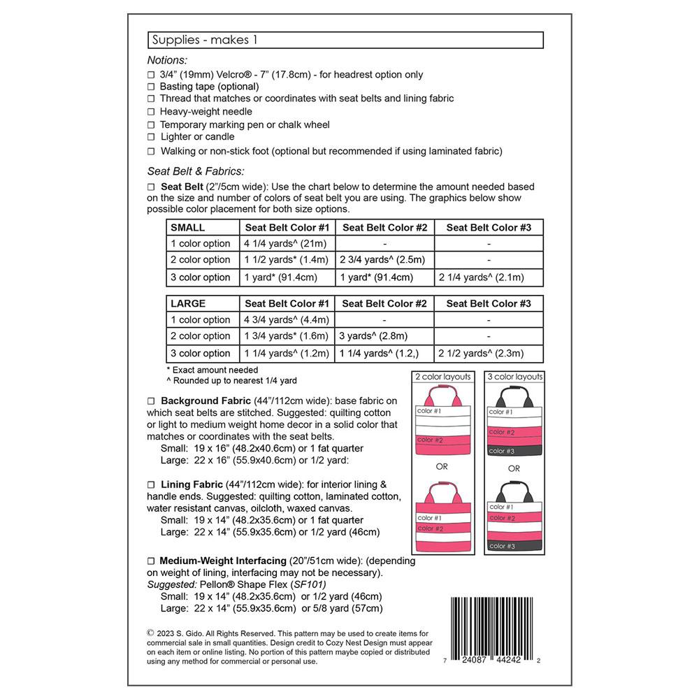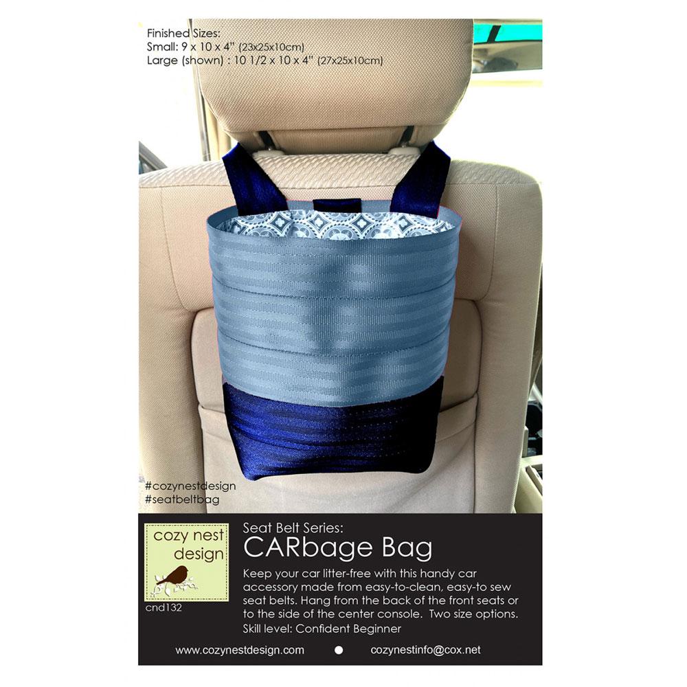 Stitch up a seat belt CARbage Bag! This handy vehicle accessory keeps your vehicle free of wrappers, cups and debris. This kit contains pattern and seat belt - just add fabric, interfacing and hook and loop tape. Seat belt webbing is extremely durable, easy to clean, and easy to sew on a home machine. Kit is for the small size bag. Colors: Navy and Steel Blue Skill level: Confident Beginner. See back of pattern for additional materials needed.
