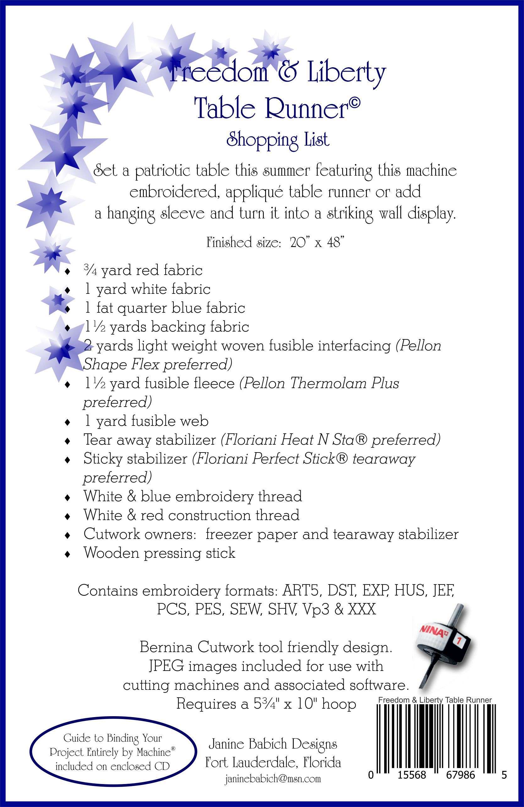 Set a patriotic table featuring this machine embroidered applique table runner, or add a hanging sleeve and turn it into a wall display. Hoop Size: Hoop Size: 5 3/4 inches x 10 inches. Formats: ART5, DST, EXP, HUS, JEF, PCS, PES, SEW, SHV, VP3 & XXX. JPEG images for use with cutting machines and software. Finished size: 20 inches x 48 inches.