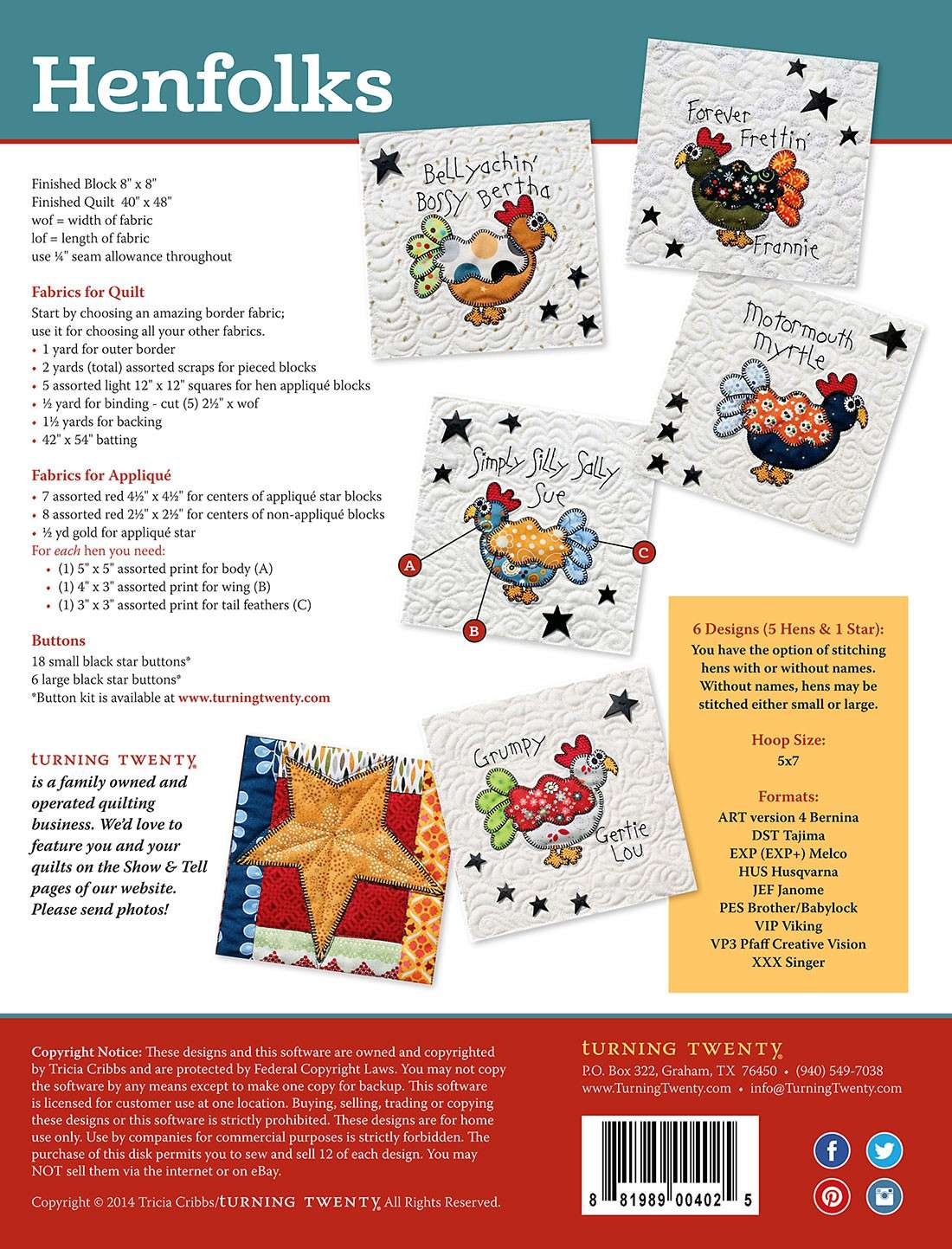 Henfolks includes 6 designs that can be stitched with or without names. Without names hens can be stitched small or large. There is also a large and small hen with no lettering. Formats: ART, DST, EXP, EXP+, HUS, JEF, PES, VIP, VP3, & XXX. Finished size: 5 inches x 7 inches.