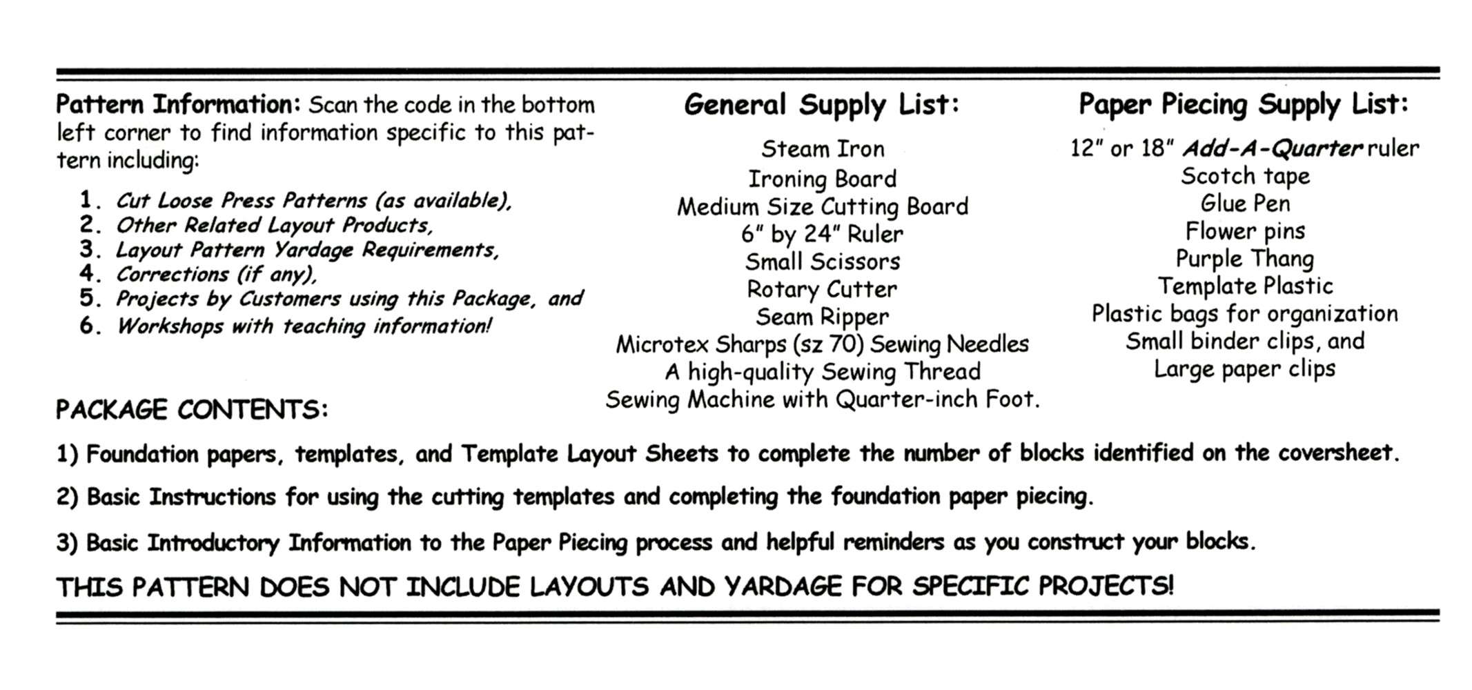 Foundation papers and template layout sheets to complete the number of blocks identified on the coversheet. Charm Elements Pack #4 includes(2) Newsprint sheets with enough Foundation Papers to make(12)6in x 12in Convex Spiked Blocks. These blocks can be constructed using 2-1/2in strips. The product is designed to be mixed and matched with other Charm Elements, complete small projects, to be used by other designers in their own layouts, as demonstration tools, or adaptable for shop hops and unique Block of the Month patterns for shops. This product has been used in various Cut Loose Press patterns, which can be referenced for layout information and project yardage if desired.
