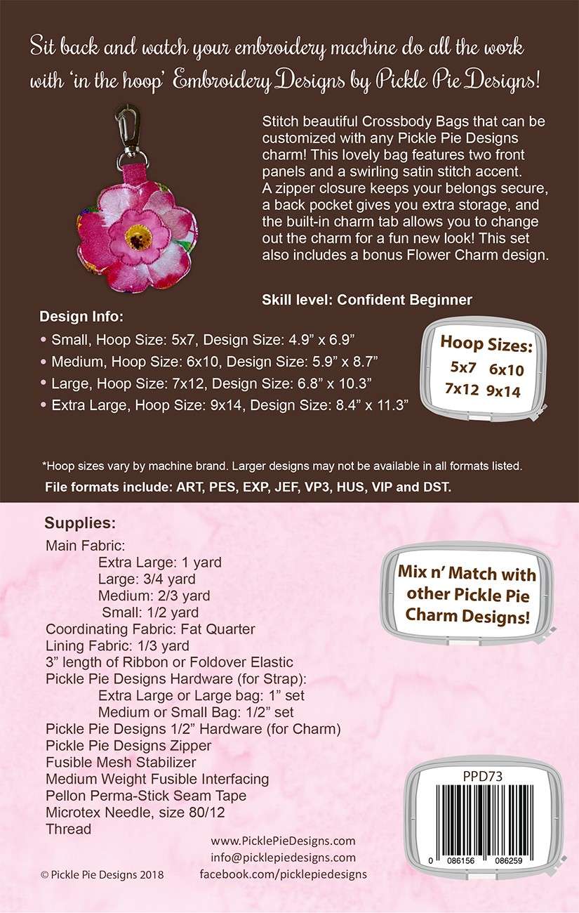 Stitch beautiful Crossbody Bags that can be customized with any Pickle Pie Designs charm or fob! This lovely bag features two front panels and a swirling satin stitch accent. A zipper closure keeps your belongs secure, a back pocket gives you extra storage, and the built-in charm tab allows you to change out the charm for a fun new look! This set also includes a bonus Flower Charm design. Sizes: * Small, Hoop Size: 5x7, Design Size: 4.9” x 6.9” * Medium, Hoop Size: 6x10, Design Size: 5.9” x 8.7” * Large, Hoop Size: 7x12, Design Size: 6.8” x 10.3” * Extra Large, Hoop Size: 9x14, Design Size: 8.4” x 11.3”