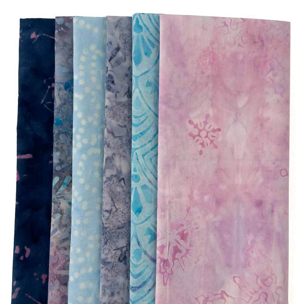 Chillin out with these cool batiks! The Chillin Out 6-piece fat quarter medley is a must for your wintertime themed batik fabric stash featuring winter designs in a color palette of pink, aqua and icy blue + gray.