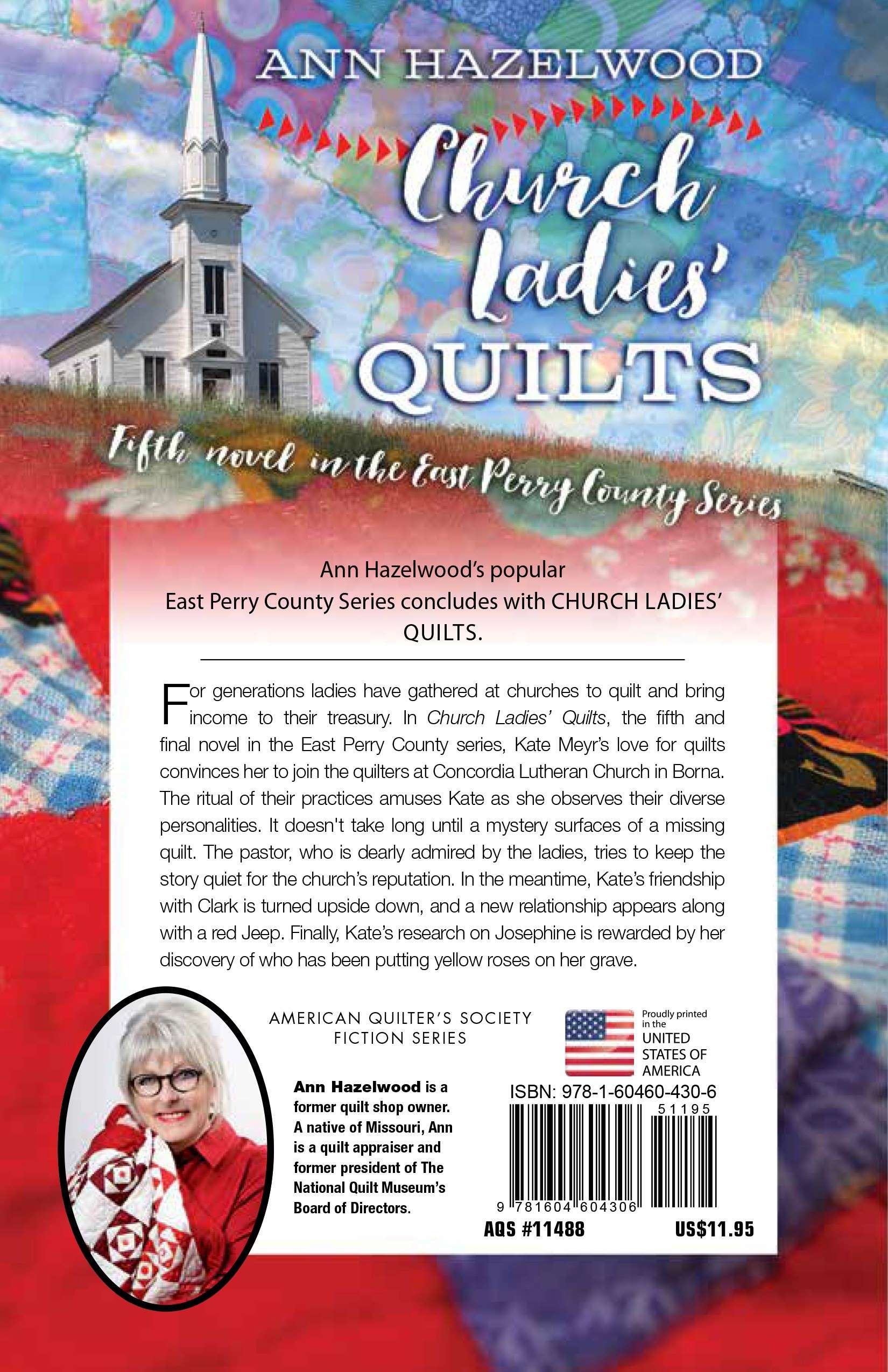 For generations, ladies have gathered at churches to quilt. In Church Ladies' Quilts, the fifth and final novel in the East Perry County series, Kate Meyrs love for quilts convinces her to join the quilters at Concordia Lutheran Church in Borna. The ritual of their practices amuses Kate as she listens to their diverse personalities. It doesn't take long, after Kate joins them, for a mystery of a missing quilt to surface. The Pastor, who is dearly admired by the ladies, tries to keep the story quiet for the church s reputation. In the meantime, Kate s friendship with Clark is turned upside down and a new relationship appears with a red Jeep. Kate's research on Josephine is enhanced by discovering who has been putting yellow roses on her grave.