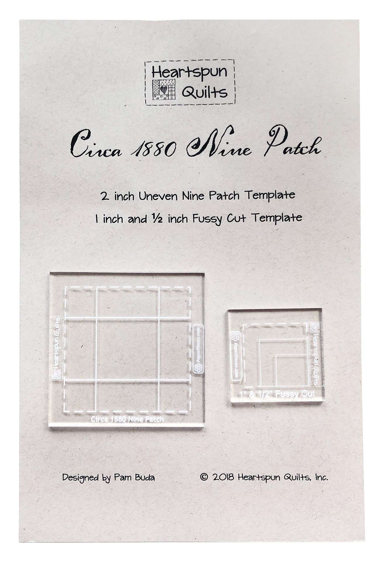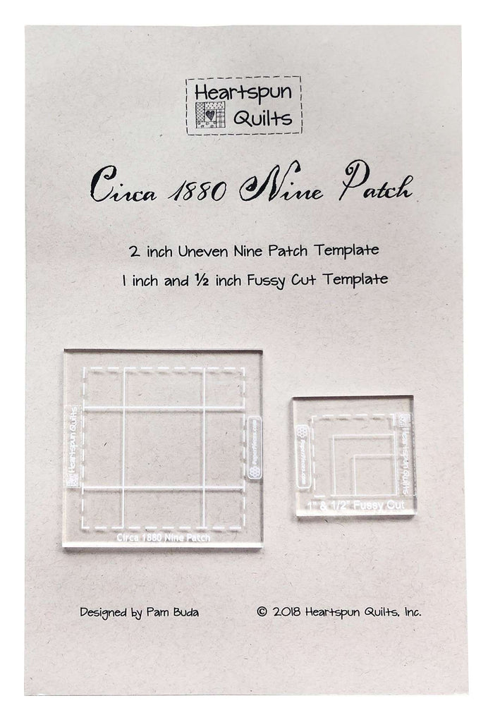 Template set companion to The Circa 1880 Nine Patch quilt pattern. 2 inch uneven nine patch square up template and 1 inch & 1/2 inch fussy cut template for all blocks. Color instructions included.