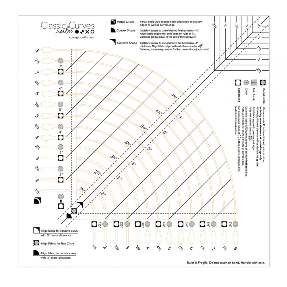 14 slots for cutting or tracing curved shapes for quilting -slots range in size from radius of 1 1/2" - 8" -lines on the ruler indicate placement of fabric for cutting concave and convex shapes (quarter circle, half circle, full set-in circle, orange peel). Transparent non-slip surface on back of ruler. Instruction insert includes basic directions for use plus a quilt pattern for beginners. Slots for sizes 1 1/2" - 3 1/2" are slightly wider, intended for use with pencil to make EPP or applique templates, mark quilting designs, curved corners, or scallop edges. These slots will also accommodate a blade for cutting. Slots 4"-8" are standard cutting grooves intended for use with typical rotary cutter.
