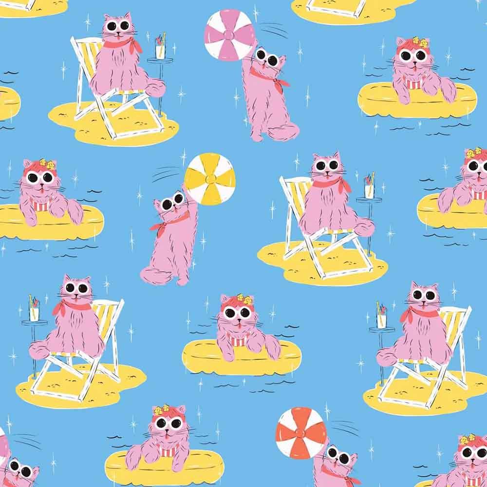Cloud9 Fabrics - Poolside Purrfection by Krissy Mast - Organic Cotton - Kitty Poolside Fun - Blue - Yardage
