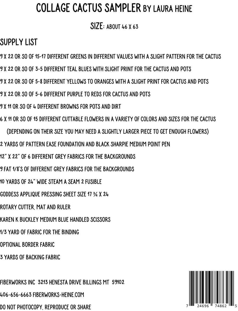 Collage Cactus Sampler Pattern includes complete instructions and full sized patterns to complete the 9 block Sampler quilt. Finished Size: 46 inches x 63 inches. Fabric not included.
