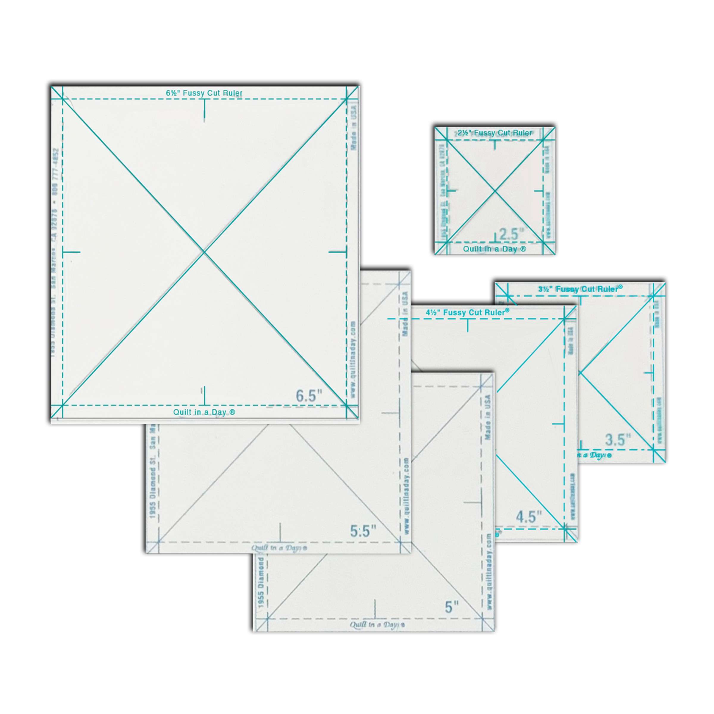 A fussy cut is a selected image, such as a flower, centered on your patch. With a Fussy Cut Ruler, you can cut the identical image from your fabric repeatedly with ease. The Complete Fussy Cut Ruler Set is a set of six laser precise heavy gauge plastic rulers in these sizes: 2 1/2, 3 1/2, 4 1/2, 5, 5 1/2 and 6 1/2. Quarter inch lines are provided for seam allowances. Perfect places for Fussy Cuts are the center or four corners of your block, or the cornerstones of lattice. Fully illustrated and detailed instructions are included.