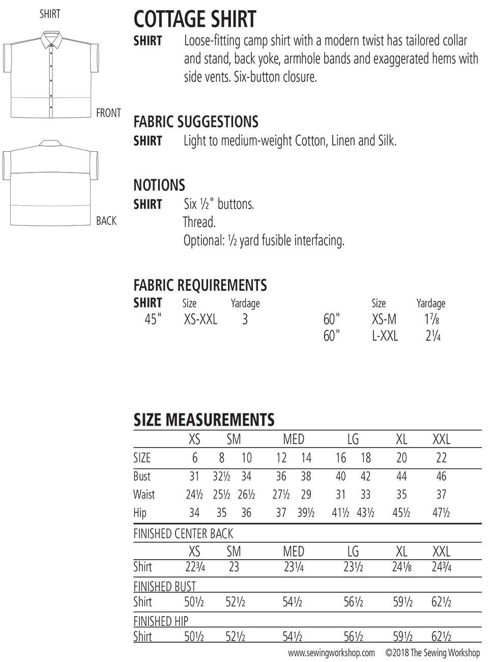 Fabric Suggestions: Light to medium-weight Cotton, Linen and Silk.