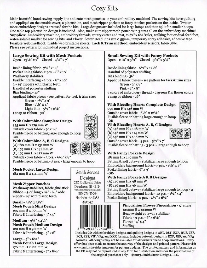 More beautiful hand sewing supply kits and cute mesh pouches on your embroidery machine! The sewing kits have quilting and applique on the outside cover, a pin cushion, and mesh zipper pockets or fancy stitches pockets on the inside. 2 or more embroidery designs are used for the kits.