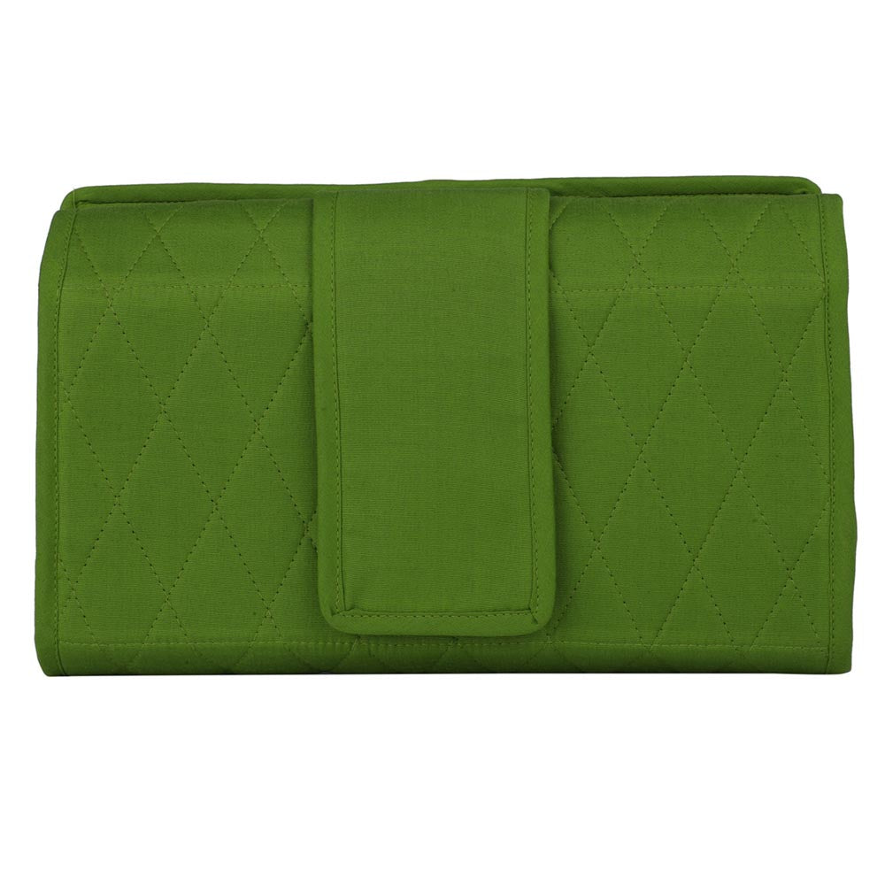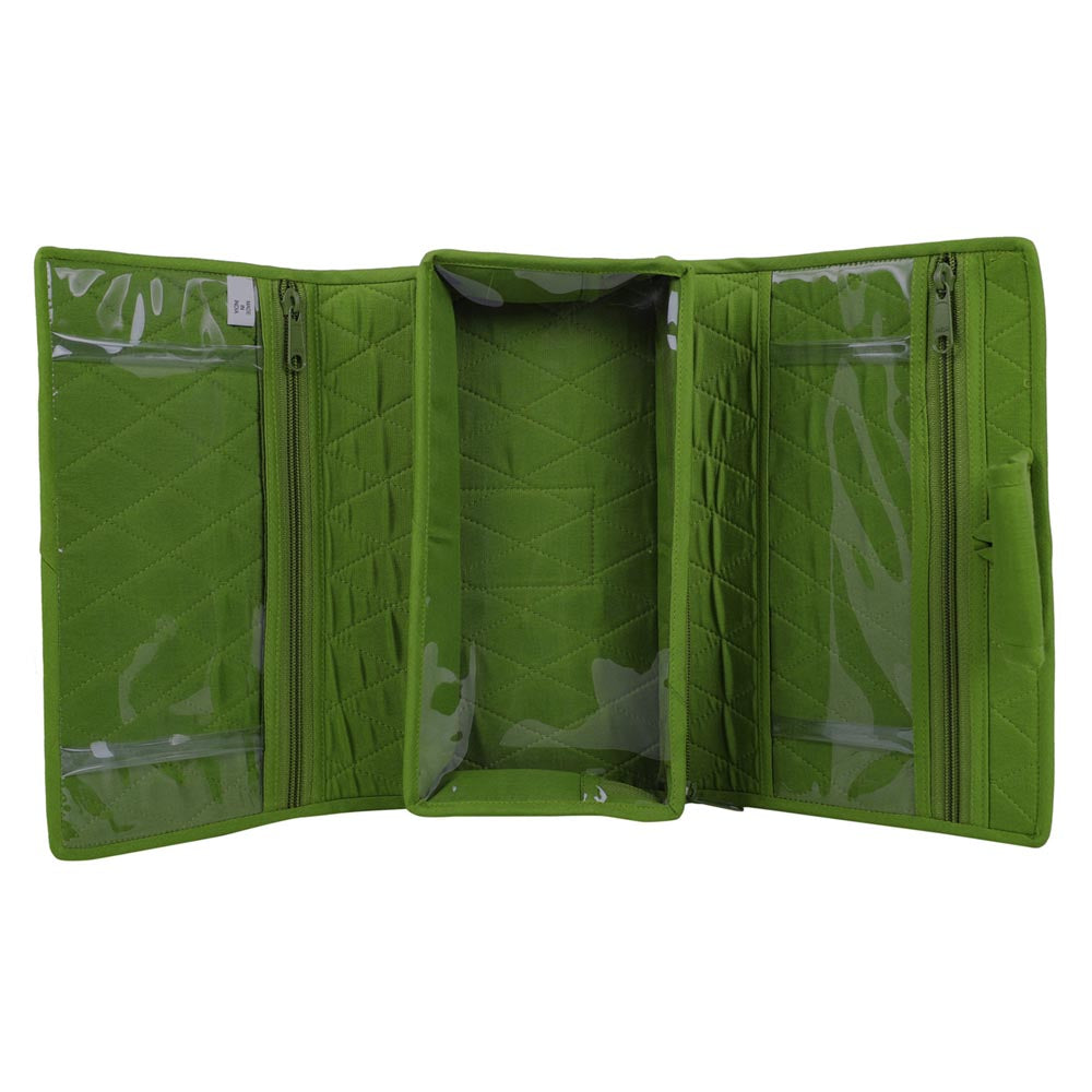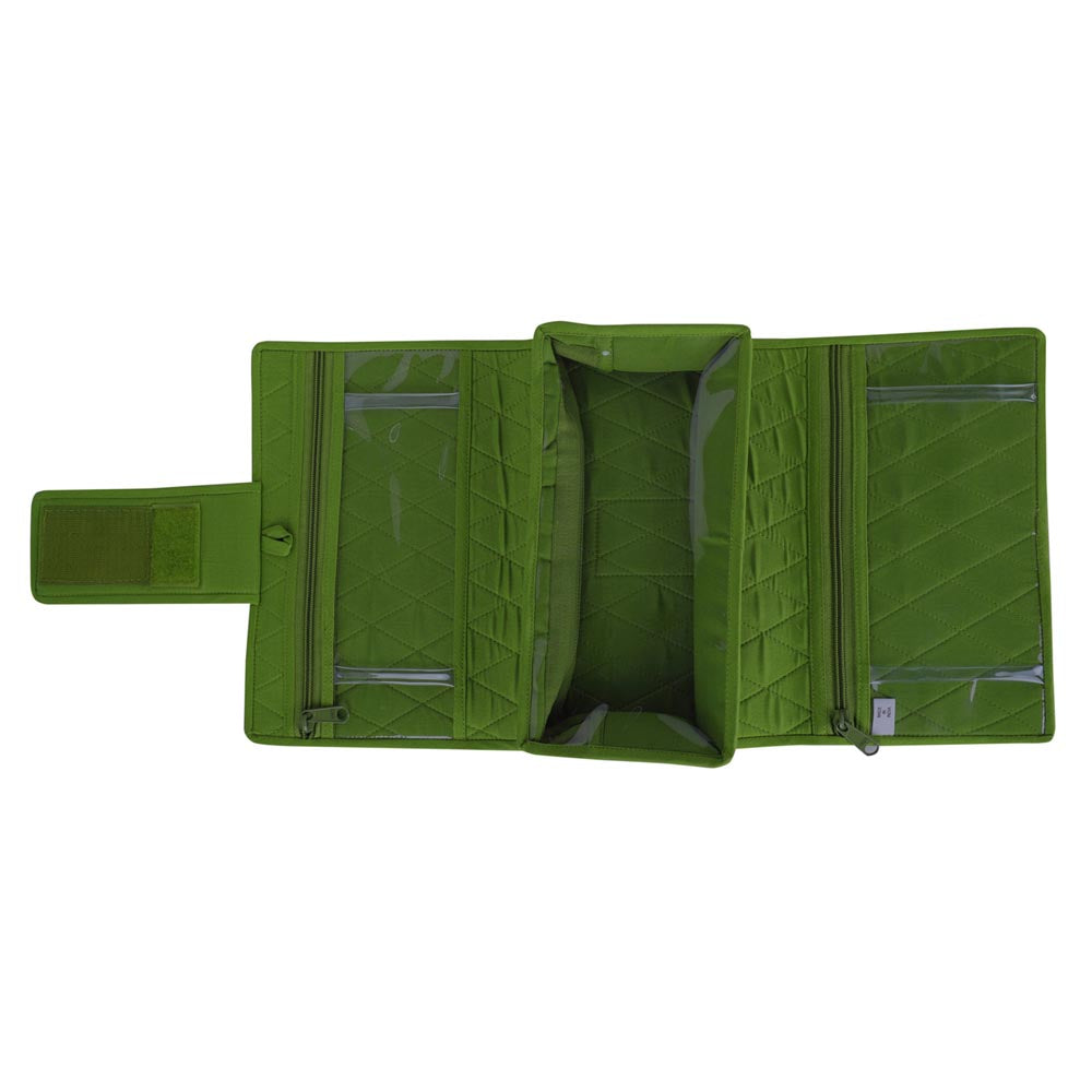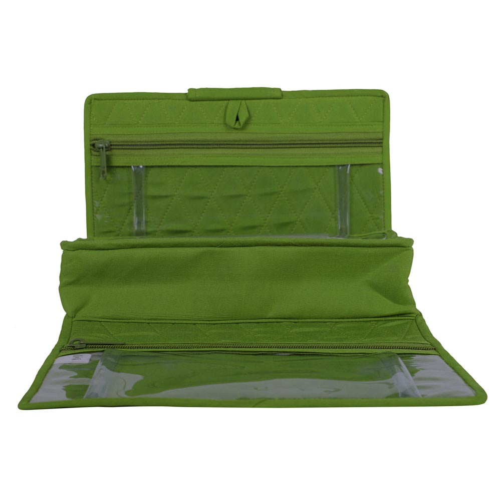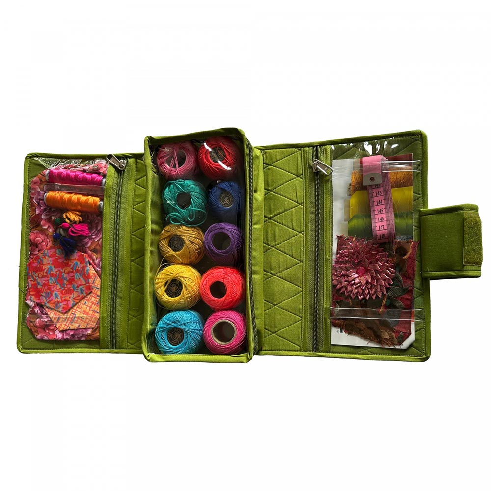 This fold-up kit is perfect for craft accessories. Triple fold with a wide hook and loop tab to close. There are 2 horizontal pleated expandable pockets, and the center compartment has an expandable base to fill with bulky items. Carry your craft items or personal items when traveling or to class.