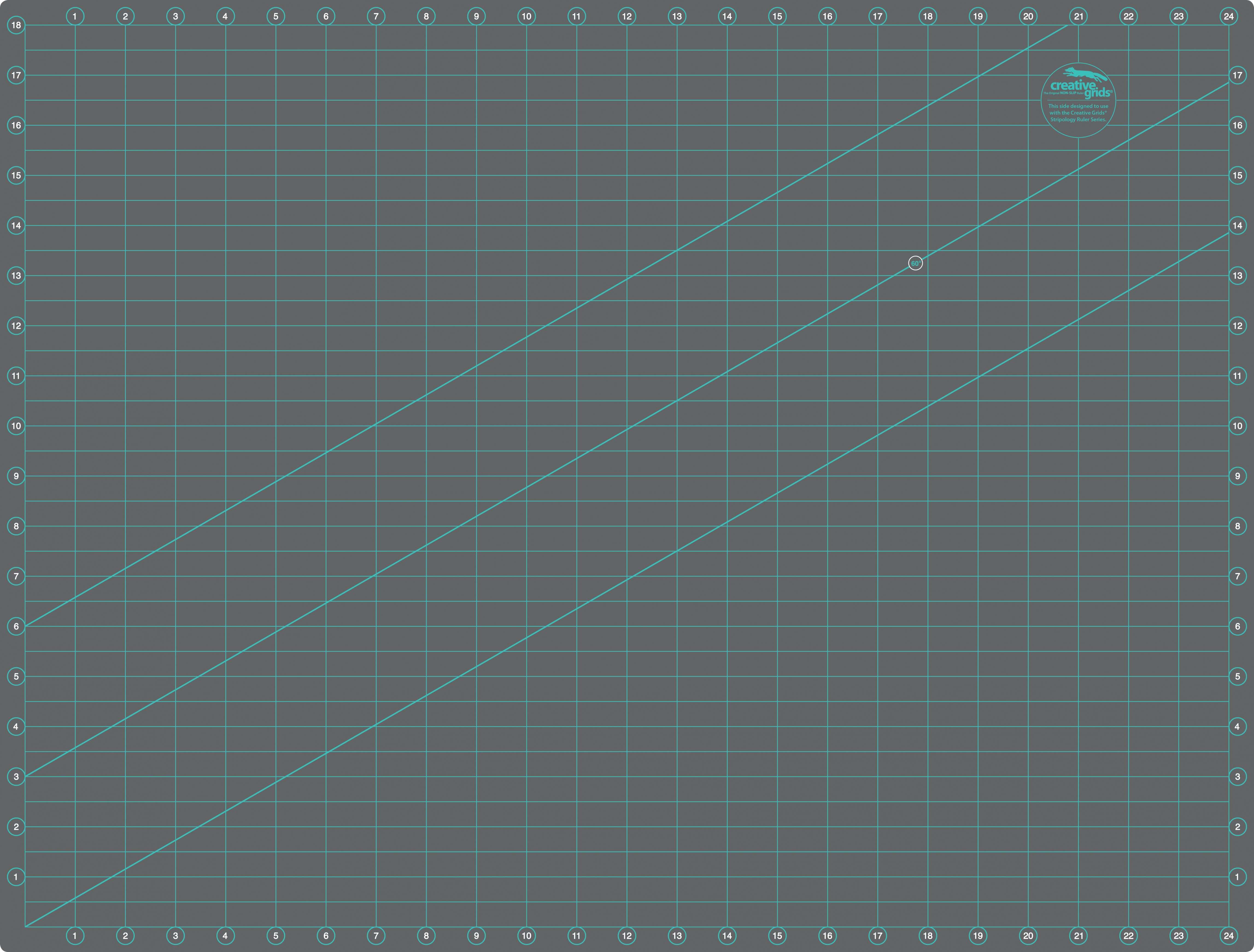 The other side is designed to use with the Creative Grids® Stripology series of rulers. Line up the fabric and rulers on the spaced horizontal half inch grid lines. That is all you need – no other distracting markings and lines are needed!