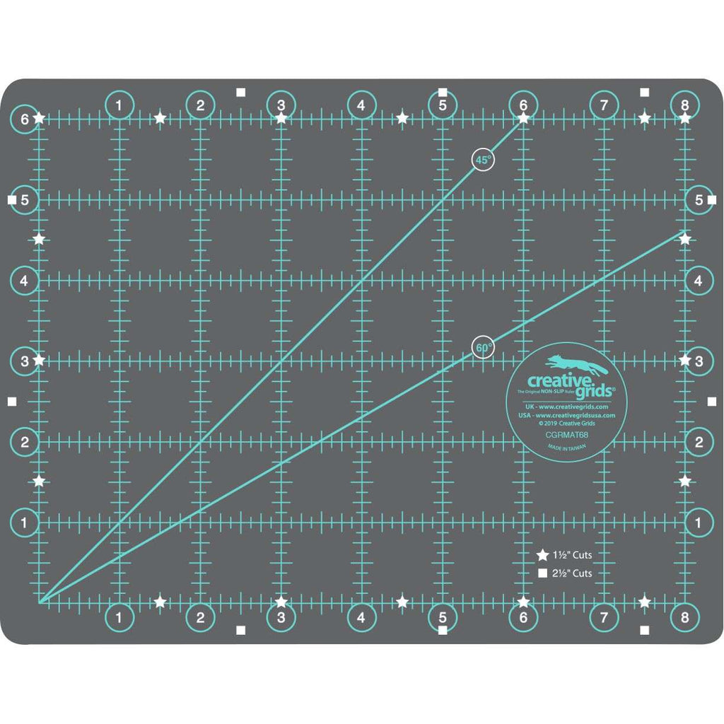 The Creative Grids® Rotary Cutting Mat is double sided. One side features one-inch grids with eighth inch markings over the entire surface. All numbers are printed outside of the grid area so they are always visible. Popular 1-1/2 inch cuts are highlighted with white stars; 2-1/2 inch cuts with white squares. The other side is blank - perfect for trimming blocks and paper-piecing.