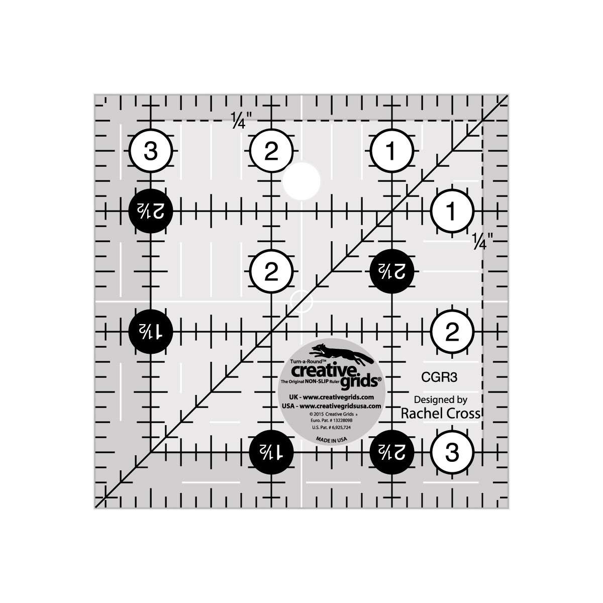 This 3-1/2 inch square features easy-to-read black and white markings printed in 1 inch grids marked in 1/8 inch and 1/4 inch increments. Use the easy-to-read, black numbers (printed on white dots) and the 1/4 inch grip sides to cut whole inches. The 1/4 inch dashed lines printed on two adjoining sides aid in trimming seam allowances. Use the patented Turn-A-Round feature – designated by the easy to read, numerical white numbers (printed on black dots) and the 1/2 inch grip sides – to add the 1/2 inch seam allowance.