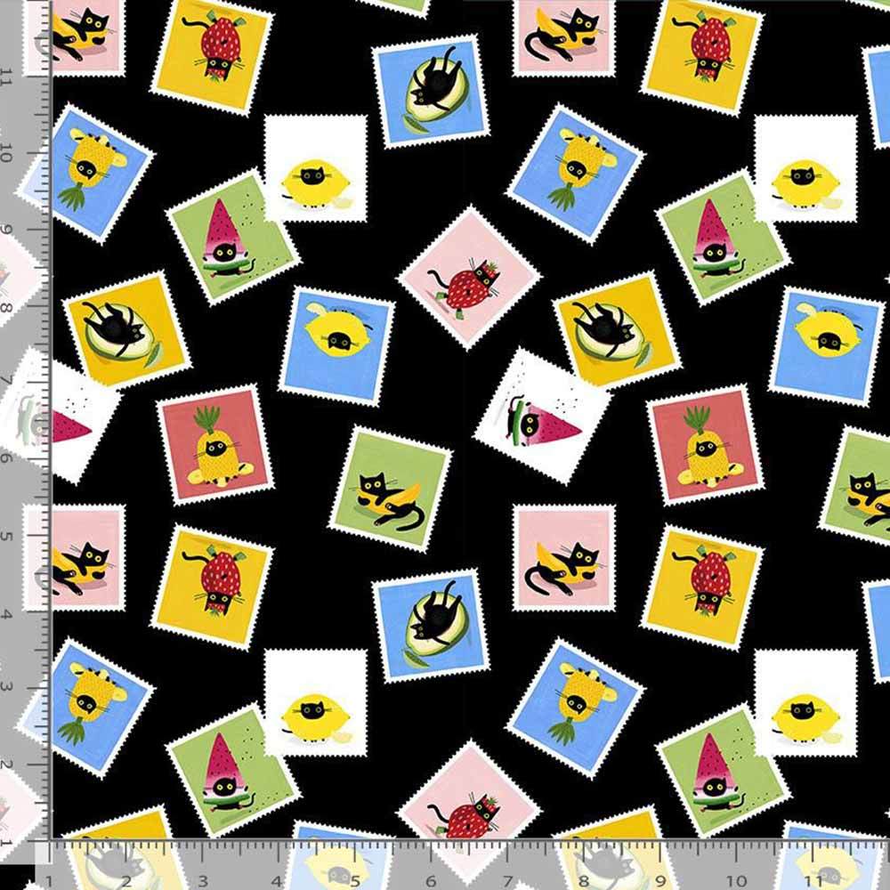 The Furruit Postage Stamps print in Multi is from the Furruit Cocktail collection by Leezaworks for Dear Stella.