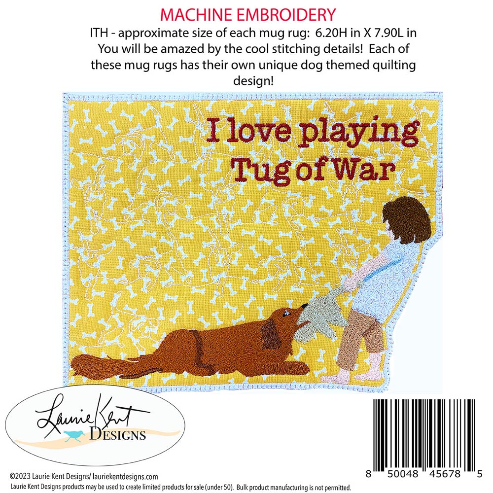 Laurie Kent Designs' exclusive machine embroidery design USB features "In The Hoop" designs of 4 In the Hoop doggie-themed mug rugs. Stitch away these adorable animals in a unique cutout design creating an "ITH" mug rug. It features 4 adorable dogs "I Love Treats", "I Love a Good Walk", "I Love Tug of War" and "I Love You So Much" Great for the dog lover and each has its own dog-themed quilting design!
