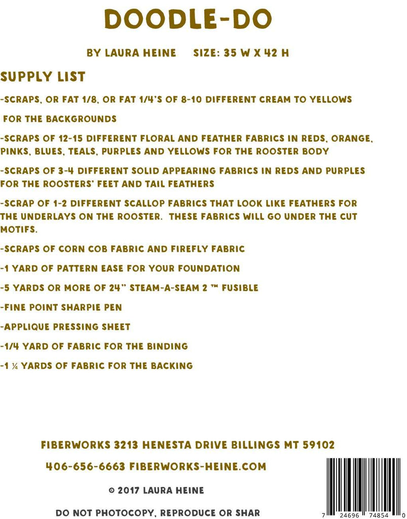 Doodle-Doo Rooster collage pattern features full size pattern and complete instructions. Finished Size: 35 inches x 42 inches. Fabric not included.