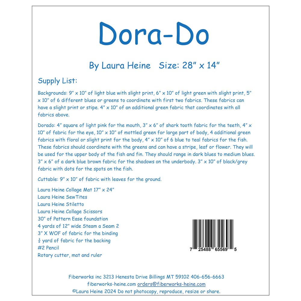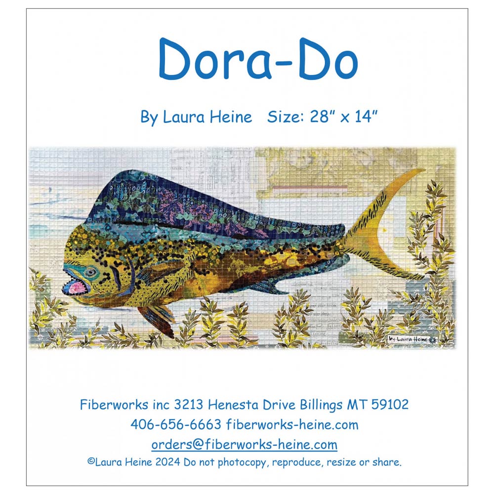 Dora-Do Collage Pattern by Laura Heine. This quilt is filled with vibrant greens, yellows and blues found on the Dorado make it one of the most recognizable fish in the ocean. Dorado's are known to be the most colorful fish in the sea. They are also known as the Golden One or Mahi Mahi. This pattern includes a full size pattern with colorful step by step instructions. Finished size 28"x14".