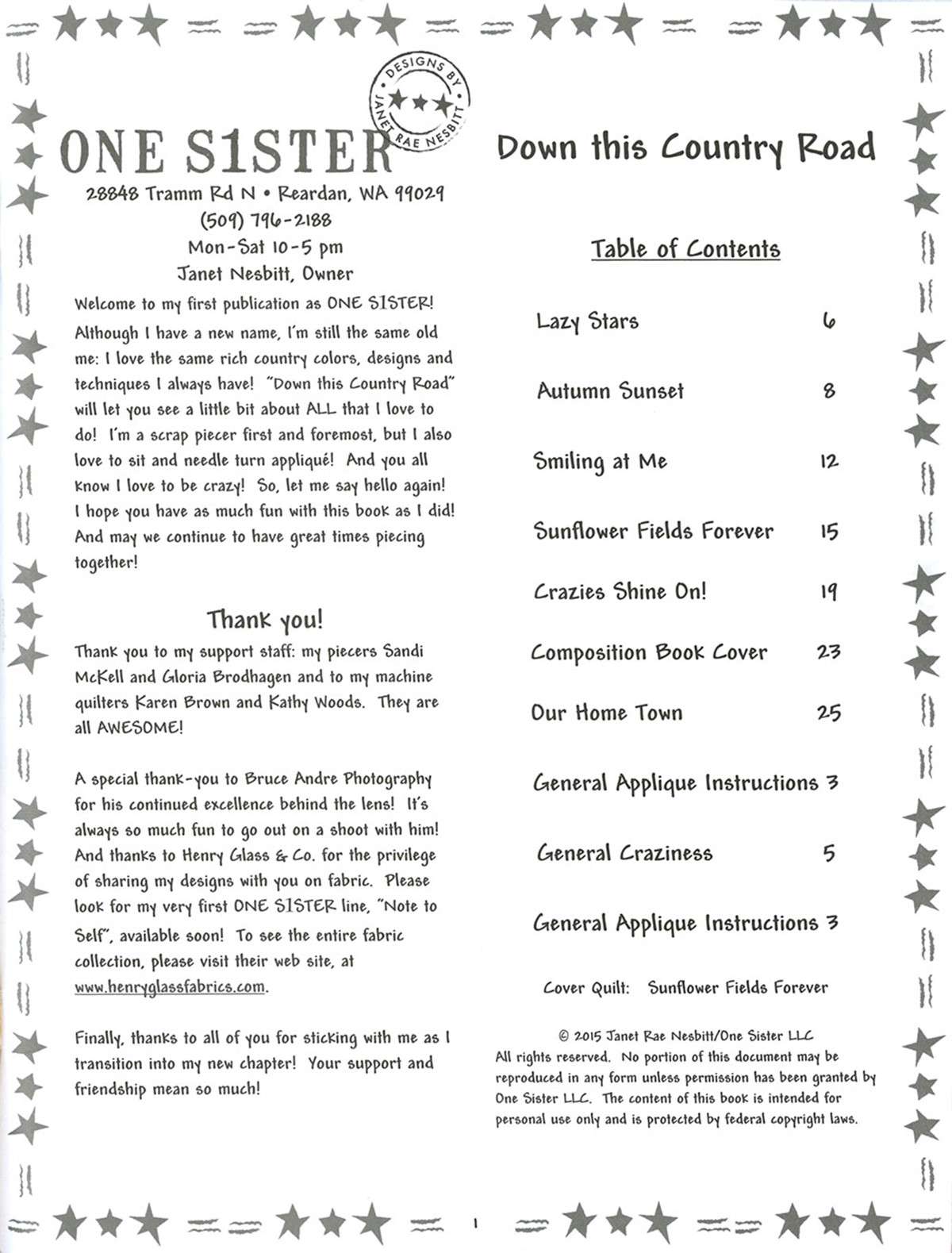 Wander down this way and you're sure to find designs you'll love! Janet Nesbitt's first book as One Sister provides you with 52 pages, six quilts, and one journal cover, incorporating a variety of piecing techniques including Janet's crazy piecing technique as well as ore traditional piecing practices including applique. Enjoy your quiet time while you applique this fabulous journal cover! It's wonderful both inside and out! Then after your done with your piecing, you can enjoy just a bit of applique on either "Smiling at Me" or "Our Home Town". There's even more to enjoy with the wool applique on "Autumn Sunset" since there are no edges to turn under and it adds so much dimension to the quilt!