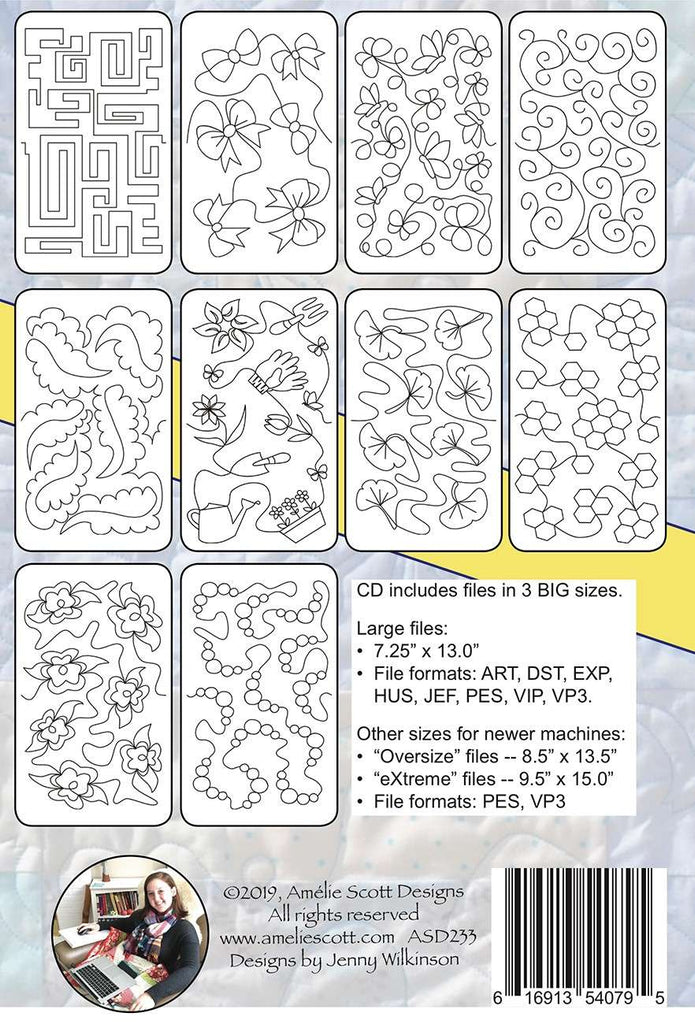 The Edge-to-Edge Jumbo Pack has 10 quilting designs specifically made for the largest hoops on the market. The Large designs are still the same as in all of the other Expansion packs, but the Oversized designs are intended for the new Pfaff and Viking 360 mm x 260 mm hoops, and the Extreme designs are available for the new Baby Lock and Brother 272 mm x 480 mm hoops. Intended to be used with our book, Edge-to-Edge Quilting on Your Embroidery Machine (Part #ASD201), this Expansion Pack does not include instructions. Large files Dimensions: 7.25 inches x 13.0 inches, File formats: ART, DST, EXP, HUS, JEF, PES, VIP, VP3. Other sizes for newer machines: Oversize files -- 8.5 inches x 13.5 inches, eXtreme files 9.5 inches x 15.0 inches, File formats: PES, VP3.