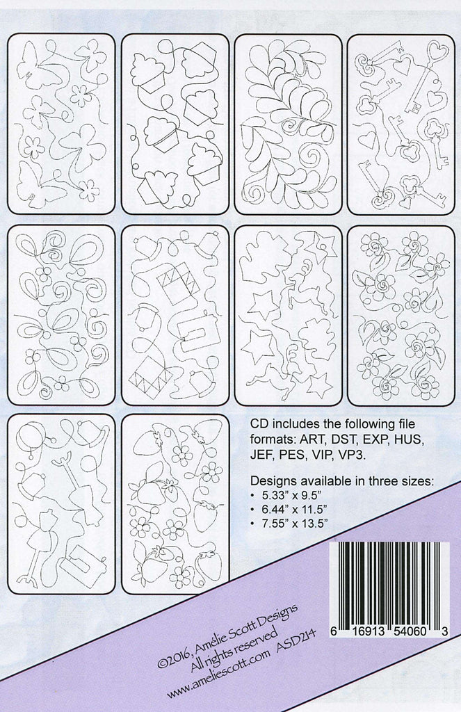 This expansion pack provides 10 additional quilting designs (Butterflies, Cupcakes, Feathery, Keys, Peacock, Quilting quilting, Reindeer, Roses, Sewing quilting, Strawberries)to use with the Easy-Connect Quilting technique, and are Intended to complement the book, Edge-to-Edge Quilting on Your Embroidery Machine (Part #ASD201). The Patterns are digital downloads. There is a code in the instructions. To use this download, you must have the instructions from the book, Edge-to-Edge Quilting on your Embroidery Machine. All files are available in three sizes: 5.59 inches x 9.5 inches, 6.77 inches x 11.5 inches, 7.5 inches x 13.5 inches.