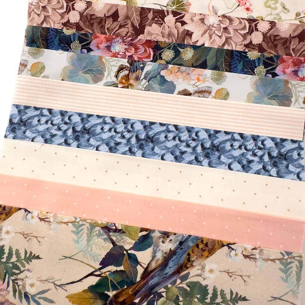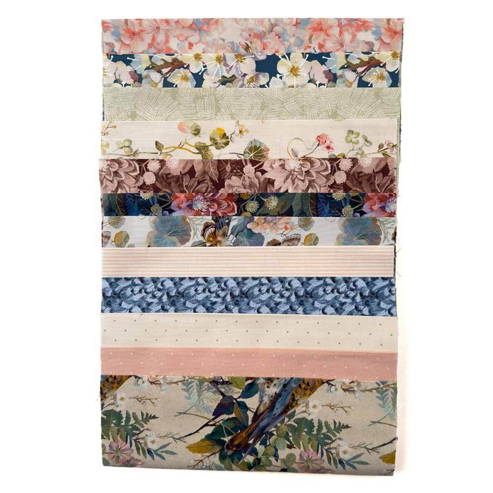 The Elegance Quarter Yard Bundle features detailed and color saturated birds, butterflies and florals along with coordinating dots, checks and tonals all in a color palette of blues, pinks and creams. Bundle includes 12 pieces.