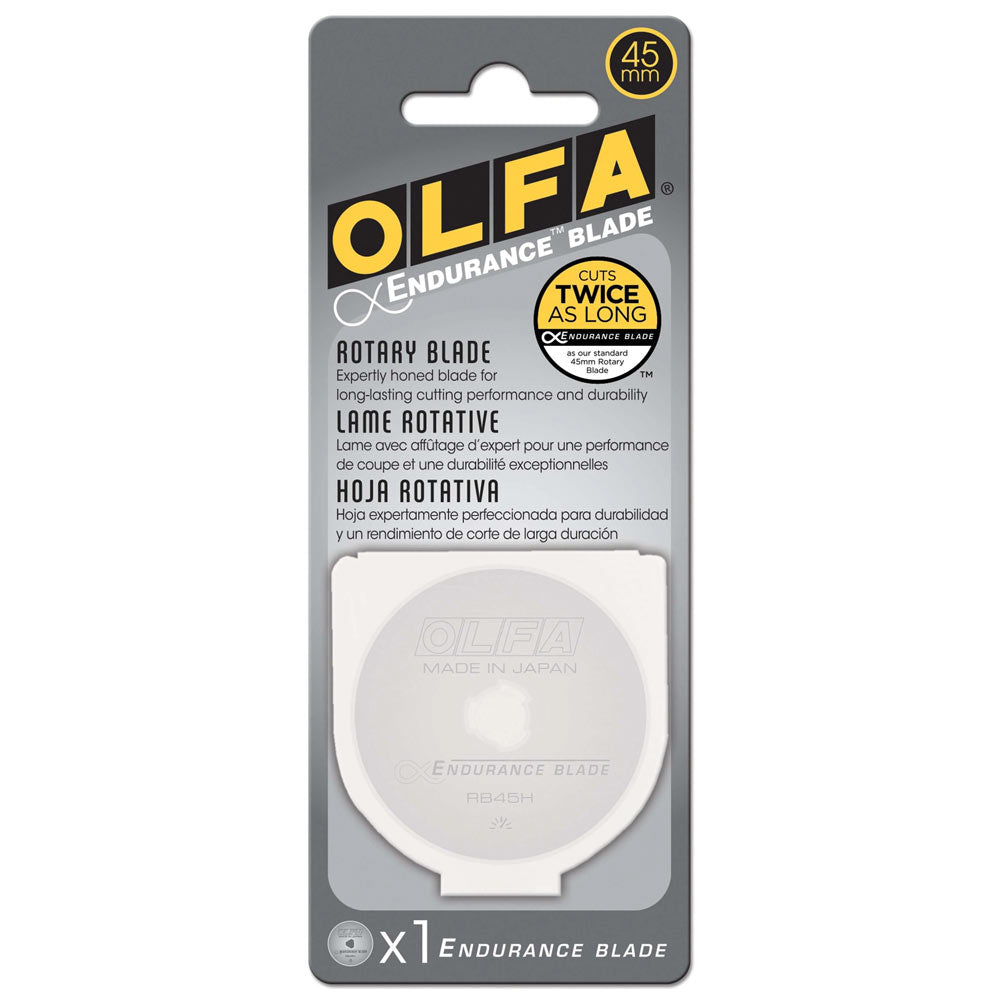 You create projects to last a lifetime and our new OLFA Endurance Rotary Blade cuts twice as long* and fits all OLFA 45mm rotary cutters. It’s the perfect marriage of precision and quality that you expect from OLFA: it cuts effortlessly and retains its edge longer.