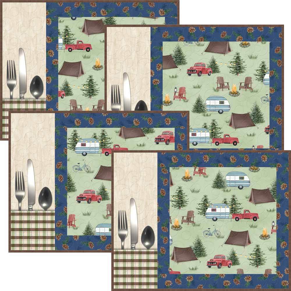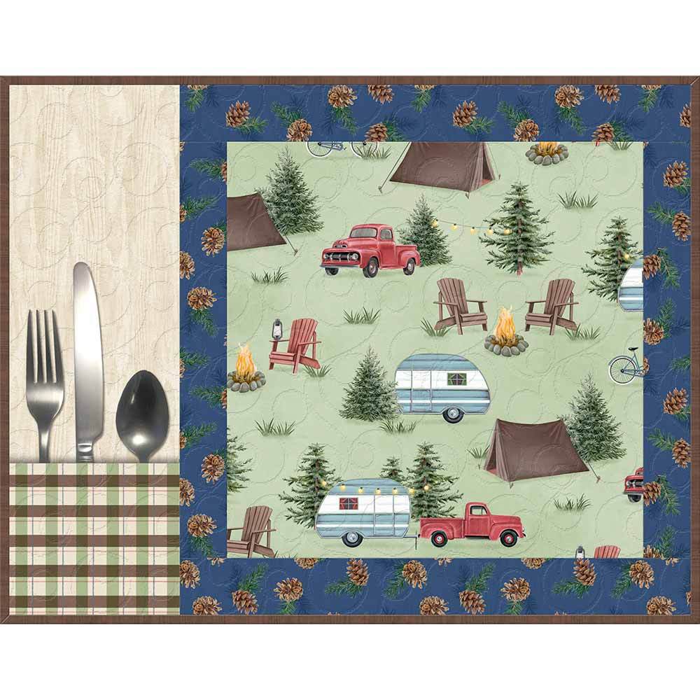 Set up the tent, string up the lights and get the fire going for s'mores...let's escape and go camping! These will certainly spruce up your decor at camp and each includes a handy pocket for your utensils. The Evergreen Escape Placemats Kit includes pattern by Wilmington Prints and all the fabrics needed for the top, binding and backing from the Evergreen Escape fabric collection by Danielle Murray. Finished size of each placemat is 18" x 14" - set of four.