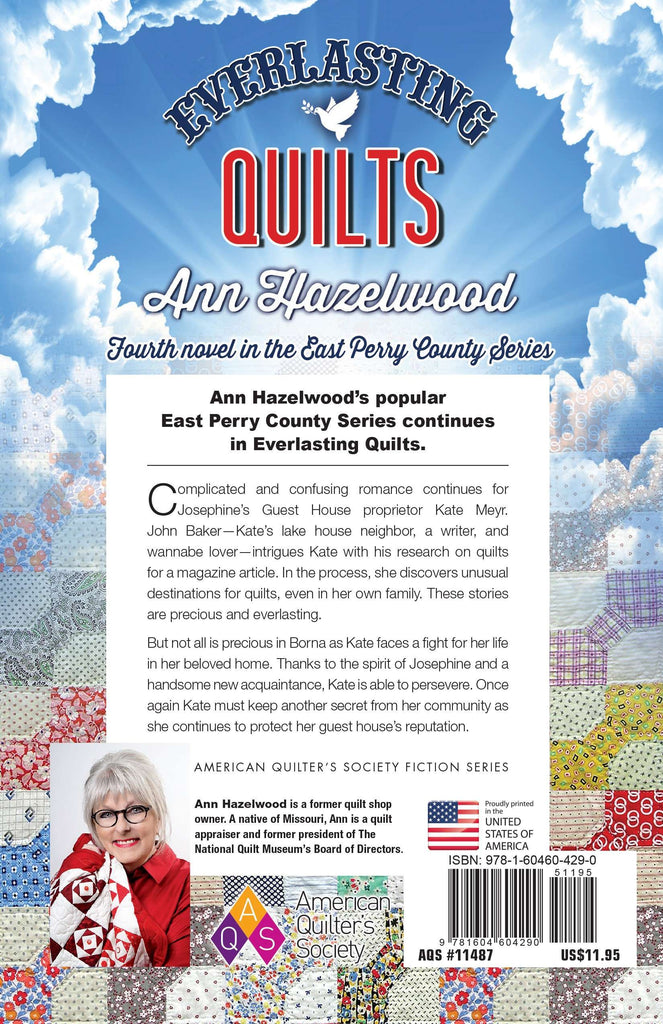 Complicated and confusing romance continues for Josephine's Guest House proprietor Kate Meyr in Everlasting Quilts, the fourth novel in the East Perry County series. John Baker, Kate's lakehouse neighbor, a writer, and wannabe lover intrigues Kate with his research on quilts for a magazine article. In the process, she discovers unusual destinations for quilts, even in her own family. These stories are precious and everlasting. But not all is precious in Borna as Kate faces a fight for her life in her beloved home. Thanks to the spirit of Josephine and a handsome new acquaintance, Kate is able to persevere. It's once again another secret that Kate has to keep from her community as she continues to protect her guest house's reputation.