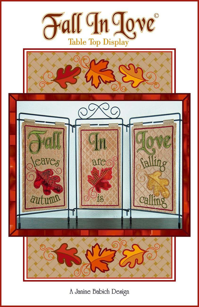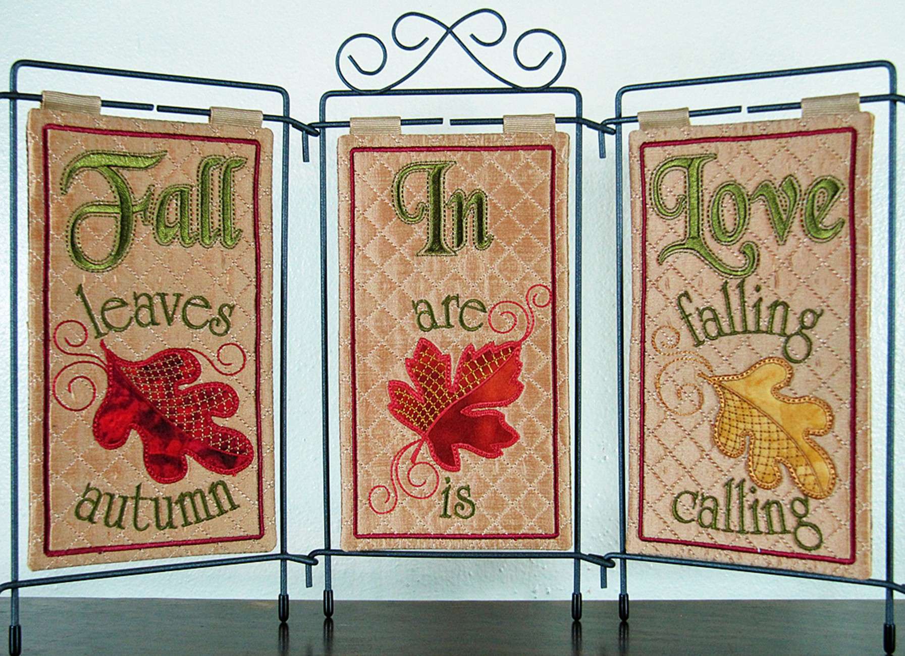 When autumn beckons, craft this Made in the Hoop salute to fall, featuring satin stitch lettering and swirling and appliqued leaves. Hoop Size: Hoop Size: 5 3/4 inches x 8 inches. Formats: ART7, ART8, DST, EMB, EXP, HUS, JEF, PCS, PES, SEW, SHV, VP3 & XXX. Bernina cutwork tool friendly design. JPEG & SVG images included for use with digital cutting software. Finished size: 16 inches wide x 11 inches tall when displayed in the trip tic stand.
