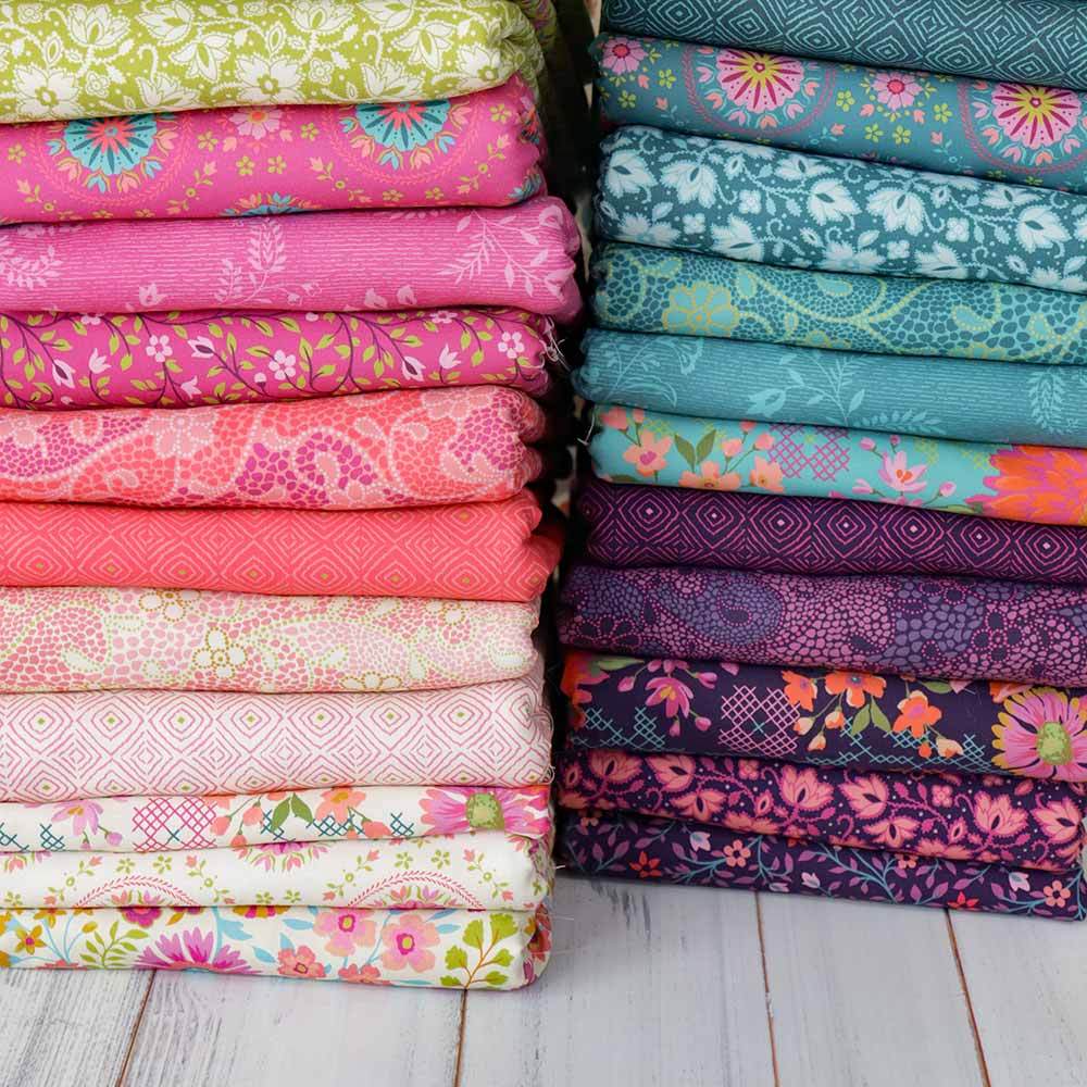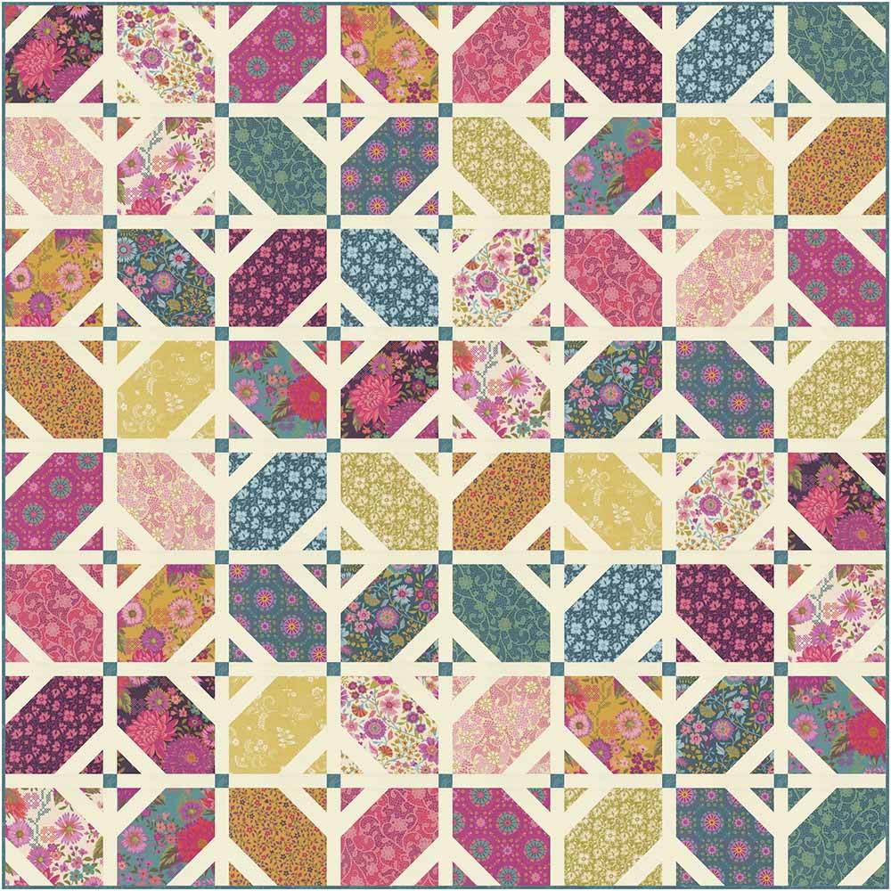 This pattern offers a lively geometric floral design and features conventional piecing to create a striking tiled layout. The Fanciful Floor Kit includes pattern by Wendy Sheppard and all the fabrics needed for the top and binding from the Parlor collection by Crystal Manning for Moda Fabrics. Finished size is 63" square. Backing available separately, 4 yards x 44" wide is recommended.