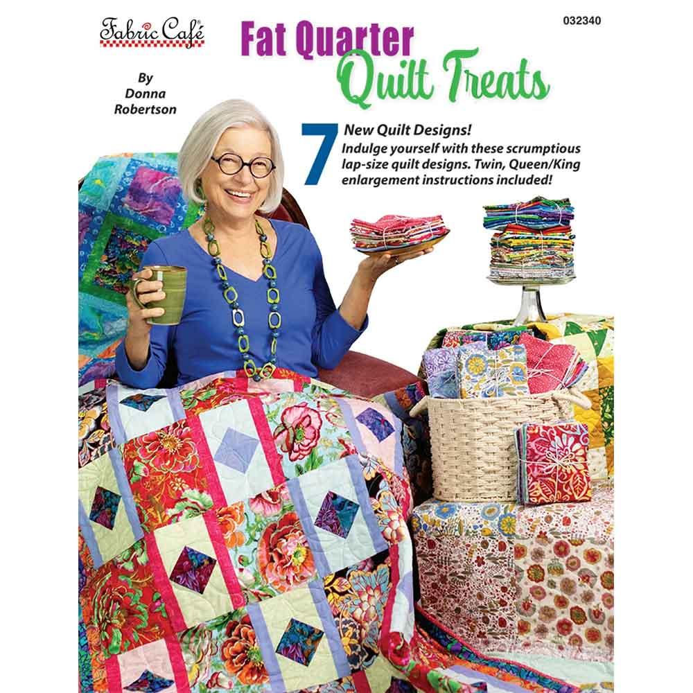 Donna Robertson co-founder of Fabric Café, known for her signature 3-yard quilt method, announces a new pattern book, Fat Quarter Quilt Treats! Each fat quarter pattern has easy-to-follow diagrams and instructions. Each quilt is intended to be an economy quilt designed to utilize 12 fat quarters, equal to 3 yards of fabric, most efficiently. All patterns are written for three sizes – lap, twin, and queen/king. This means no more complicated math when a larger size quilt is desired.
