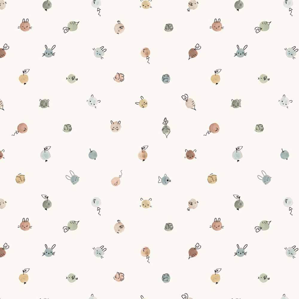 The Cotton-Tale Toss in White features dots in the softest color palette with little added sketch details that turn the dots into bunnies, birds and fruits. Designed by Bernadett Urbanovics for Figo Fabrics.