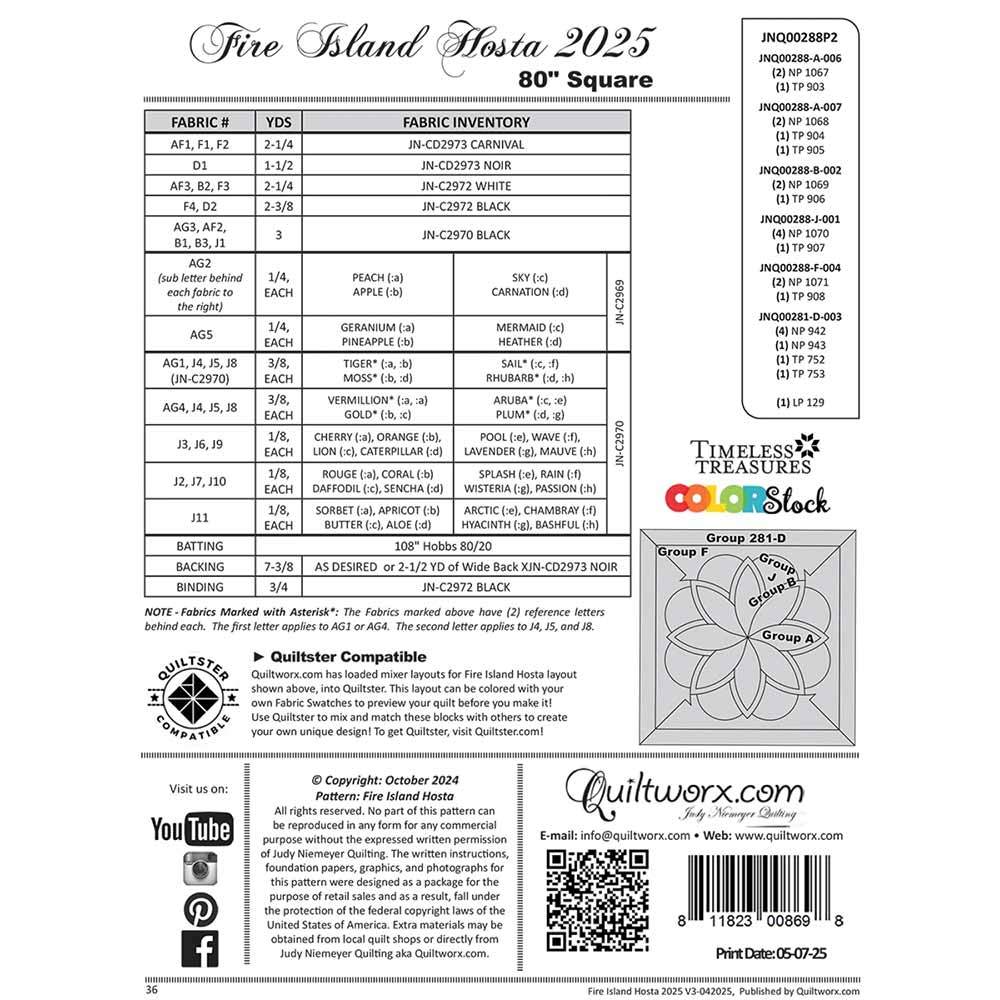 Introducing the new Fire Island Hosta 2025, the latest update to one of Quiltworx’s most cherished designs. If you’ve been on the lookout for a quilt that combines tradition with a modern twist, you’re in for a treat. This beauty features an updated layout with fresh papers and Judy’s latest techniques, making it easier than ever to piece and assemble a gorgeous quilt. This pattern is not compatible with the original Fire Island Hosta. This pattern includes instructions, coversheet, yardage information and the foundation papers.