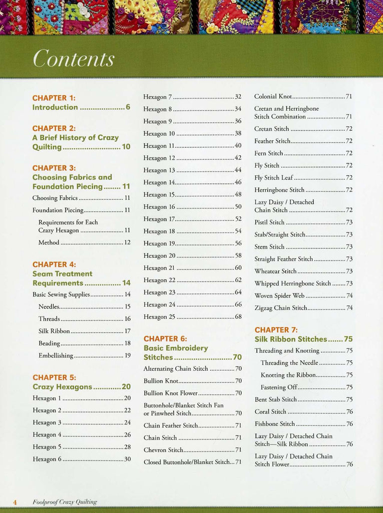 Nothing shows off beautiful stitching and embellishments like the blank canvas of a crazy quilt. Jenny Clouston's gorgeously illustrated primer shows you how to make your own heirloom crazy quilts. Learn which fabrics, threads, and needles to use; how to piece crazy quilt blocks; how to embroider with thread, ribbons, beads, and other embellishments; how to assemble your blocks into a finished quilt; and more. Includes complete instructions for over 100 embroidery, beading, and embellishment stitches; full-size patterns for 9 hexagonal crazy quilt blocks; and 25 stitch keys showing proper stitch placement and thread and needle selection for 25 different blocks.